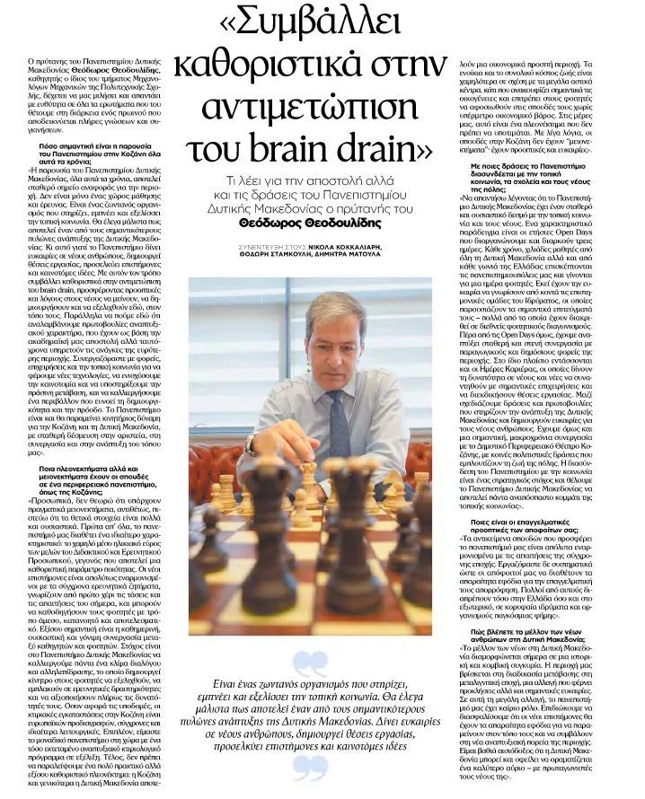 Σε συνέντευξή του, ο Πρύτανης του Πανεπιστημίου, καθηγητής Θεόδωρος Θεοδουλίδης, ανέδειξε τη σημασία της ανώτατης εκπαίδευσης ως εργαλείου ανάσχεσης του φαινομένου του brain drain, μέσα από σύγχρονα προγράμματα σπουδών, ερευνητικές δράσεις και συνεργασίες με την τοπική οικονομία και την κοινωνία.