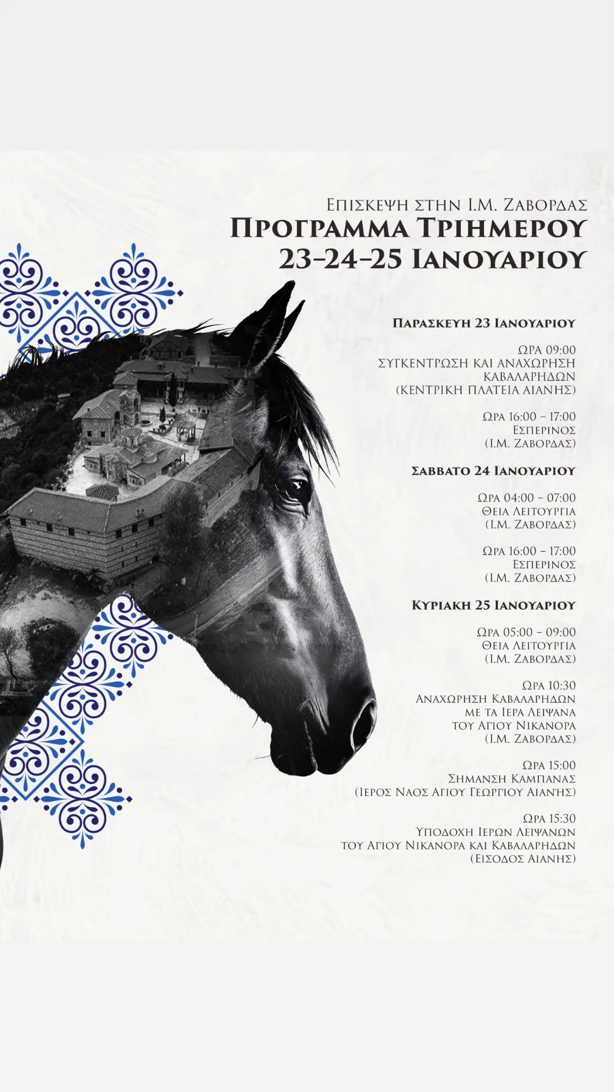 Όπως κάθε χρόνο, έτσι και φέτος, στην καρδιά του χειμώνα, οι Καβαλάρηδες της Αιανής θα επισκεφθούν την Ιερά Μονή Ζάβορδας και θα επιστρέψουν συνοδεύοντας τα Ιερά Λείψανα του Αγίου Νικάνορα.