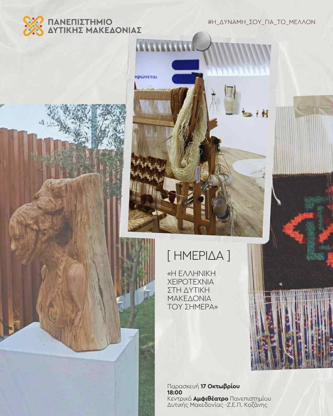 Στο Κεντρικό Αμφιθέατρο του Πανεπιστημίου Δυτικής Μακεδονίας στη ΖΕΠ Κοζάνης πραγματοποιήθηκε το βράδυ της Παρασκευής 17 Οκτωβρίου η ημερίδα με τίτλο «Η Ελληνική Χειροτεχνία στη Δυτική Μακεδονία του σήμερα». Η εκδήλωση εντάσσεται στο πλαίσιο του έργου «Δράσεις προετοιμασίας εφαρμογής Πρότυπης Στρατηγικής Ανασύστασης, Ανάπτυξης και Επαναπροσδιορισμού της Ελληνικής Χειροτεχνίας», που υλοποιείται από το Υπουργείο Πολιτισμού σε συνεργασία με τα Πανεπιστήμια Δυτικής Μακεδονίας, Θεσσαλίας και Δυτικής Αττικής.