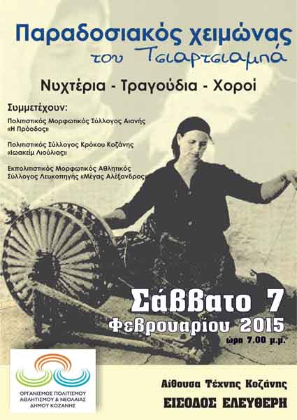 Ο Οργανισμός Αθλητισμού-Πολιτισμού και Νεολαίας του Δήμου Κοζάνης αναβιώνει το έθιμο των Νυχτεριών και των εθίμων του Χειμώνα οργανώνοντας λαογραφική εκδήλωση με τίτλο: «Παραδοσιακός Χειμώνας του Τσιαρτσιαμπά»: Νυχτέρια-Τραγούδια-Χοροί» το Σάββατο 7 Φεβρουαρίου στις 7 το απόγευμα στην Αίθουσα Τέχνης.
