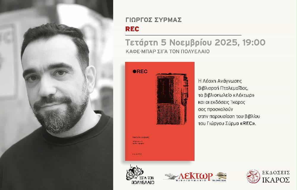 Η Λέσχη Ανάγνωσης «Βιβλιοροή» Πτολεμαΐδας, το βιβλιοπωλείο «Λέκτωρ» και οι εκδόσεις Ίκαρος σας προσκαλούν στην παρουσίαση του βιβλίου του Γιώργου Σύρμα «REC» την Τετάρτη 5 Νοεμβρίου και ώρα 19:00 στο καφέ-μπαρ «Σιγά τον Πολυέλαιο.