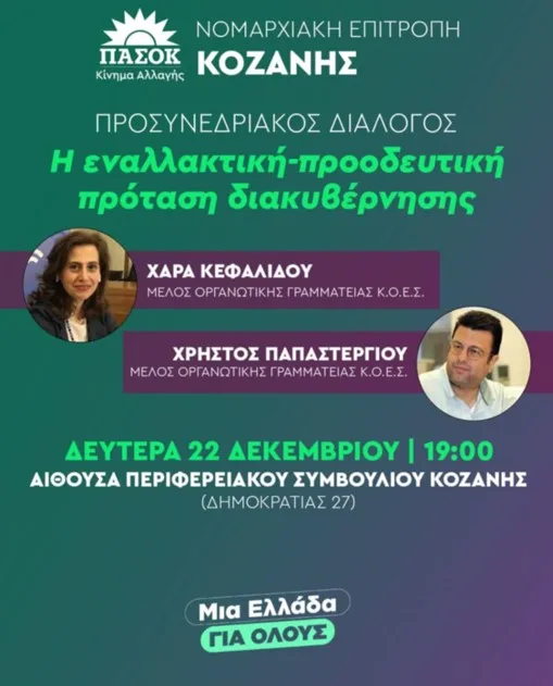 Η Νομαρχιακή Επιτροπή ΠΑ.ΣΟ.Κ. – Κινήματος Αλλαγής Κοζάνης προσκαλεί τα μέλη και τους φίλους του Κινήματος στην Ολομέλεια που διοργανώνει στο πλαίσιο του προσυνεδριακού διαλόγου, με θέμα: «Η εναλλακτική – προοδευτική πρόταση διακυβέρνησης». Εισηγητές της εκδήλωσης θα είναι η Χαρά Κεφαλίδου και ο Χρήστος Παπαστεργίου, μέλη της Οργανωτικής Γραμματείας Κ.Ο.Ε.Σ.