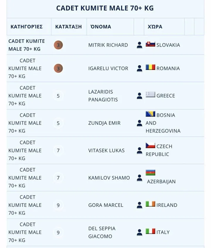 Στον αγώνα για την τρίτη θέση αντιμετώπισε ισχυρό αντίπαλο από τη Σλοβακία, χωρίς να καταφέρει να επικρατήσει, ολοκληρώνοντας ωστόσο τη διοργάνωση με μια ιδιαίτερα σημαντική πέμπτη θέση σε ευρωπαϊκό επίπεδο.