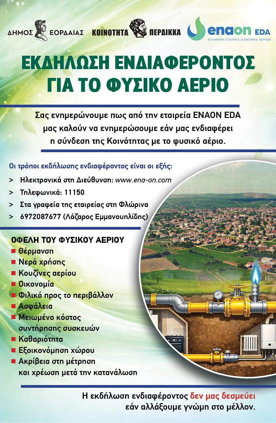 Σε φάση κινητοποίησης βρίσκεται η κοινότητα Περδίκκα, μετά από αίτημα της εταιρείας διανομής αερίου προς τους κατοίκους να εκδηλώσουν ενδιαφέρον για σύνδεση με το δίκτυο φυσικού αερίου. Στις γραμματοθυρίδες έχει ήδη διανεμηθεί ενημερωτικό φυλλάδιο με οδηγίες για τη διαδικασία.