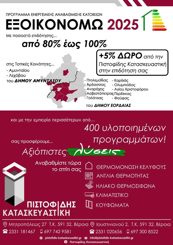 Έχετε εγκεκριμένη αίτηση στο πρόγραμμα ενεργειακής αναβάθμισης κατοικιών ΕΞΟΙΚΟΝΟΜΩ 2025 στις περιοχές αυξημένης οικονομικής ενίσχυσης 80%;