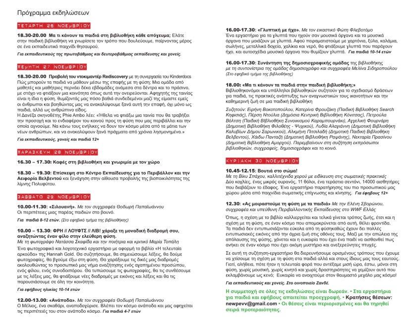Η συμμετοχή σε όλες τις εκδηλώσεις είναι δωρεάν. Για τα εργαστήρια για παιδιά και εφήβους απαιτείται προεγγραφή στο newpevv@gmail.com. Οι θέσεις είναι περιορισμένες και θα τηρηθεί σειρά προτεραιότητας.
