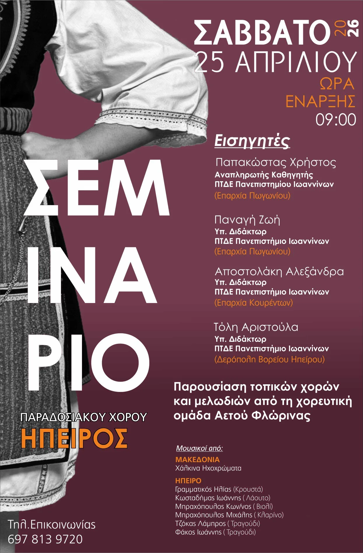 Στο πλαίσιο του σεμιναρίου θα παρουσιαστούν επίσης τοπικοί χοροί και μελωδίες από τη χορευτική ομάδα του ΜΠΣ Αετού, δίνοντας έμφαση στη σύνδεση της ακαδημαϊκής γνώσης με τη ζωντανή τοπική πολιτιστική παράδοση.
