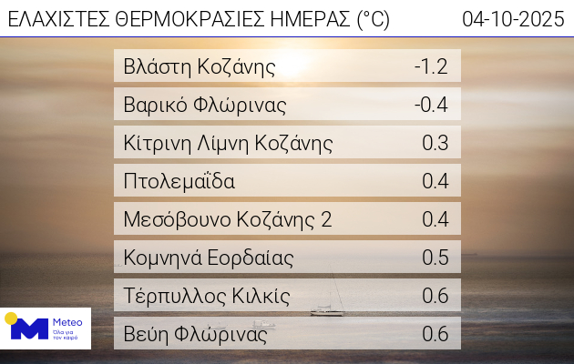 Με ιδιαίτερα χαμηλές θερμοκρασίες ξεκίνησε η σημερινή ημέρα στη Δυτική Μακεδονία, όπου καταγράφηκαν τιμές κοντά ή και κάτω από το μηδέν. Σύμφωνα με το meteo.gr, η χαμηλότερη θερμοκρασία σημειώθηκε στη Βλάστη Κοζάνης με -1,2°C, ενώ το Βαρικό Φλώρινας έφτασε τους -0,4°C.