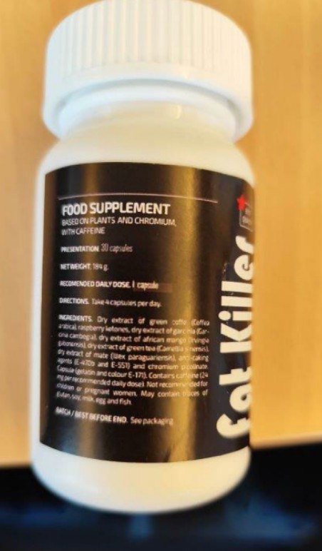 Ο ΕΟΦ, κατόπιν ενημέρωσης από τις αρχές της Γερμανίας, προειδοποιεί τους καταναλωτές να μην αγοράζουν ή κάνουν χρήση του προϊόντος FAT KILLER capsules. Το συγκεκριμένο σκεύασμα προωθείται ως συμπλήρωμα διατροφής και είναι πιθανόν να έχει διακινηθεί και στη χώρα μας μέσω ηλεκτρονικού εμπορίου.