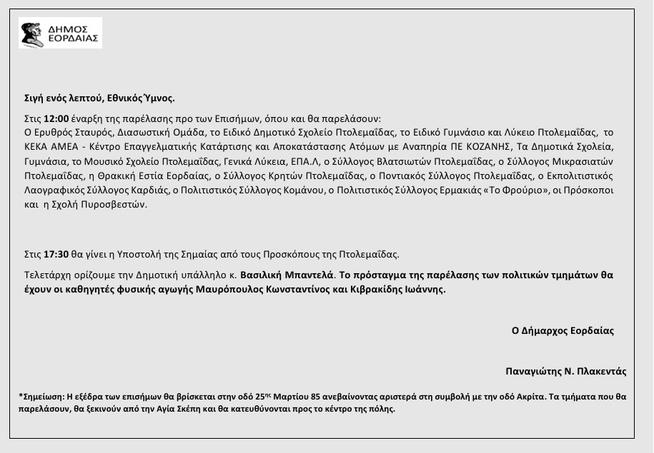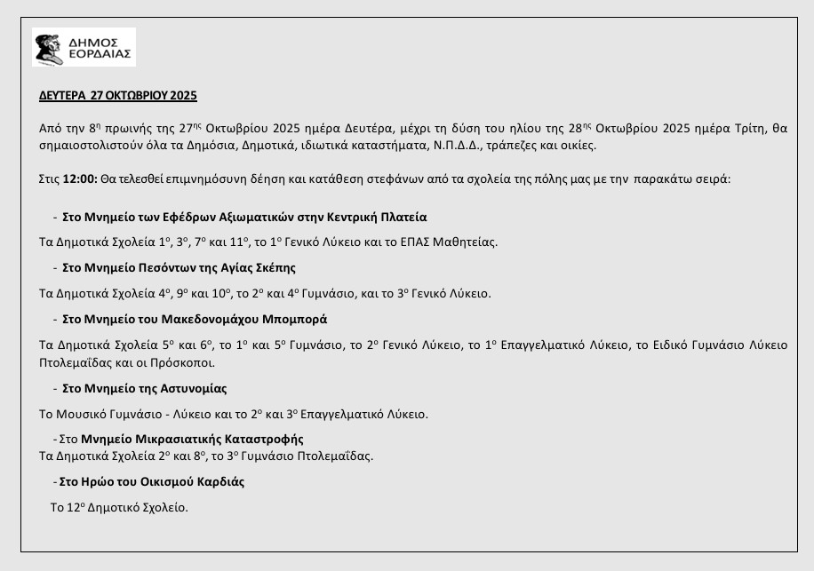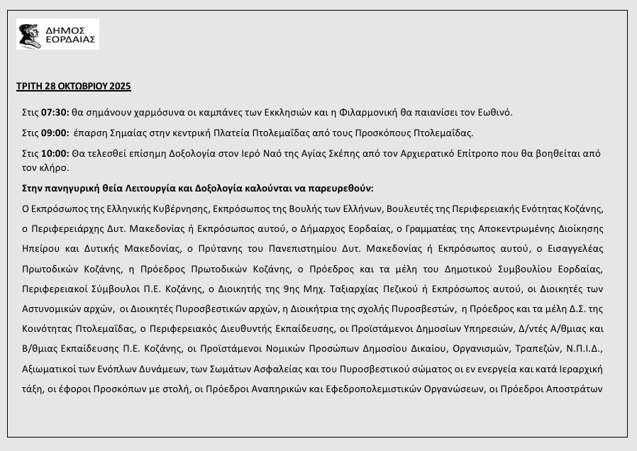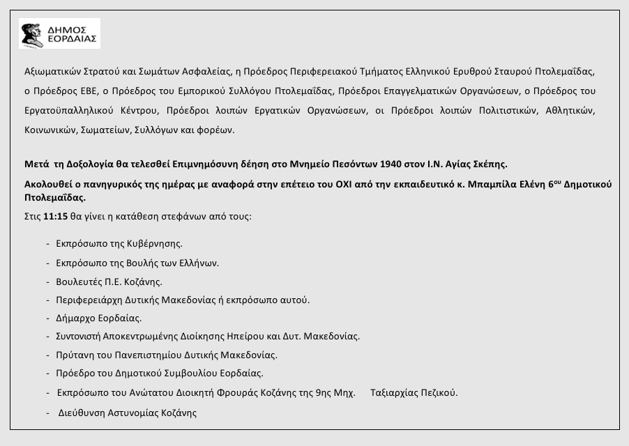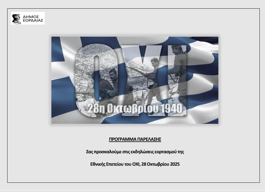 Το αναλυτικό πρόγραμμα εορταστικών εκδηλώσεων για την εθνική επέτειο του “ΟΧΙ” της 28ης Οκτωβρίου ανακοίνωσε ο Δήμος Εορδαίας ως εξής: