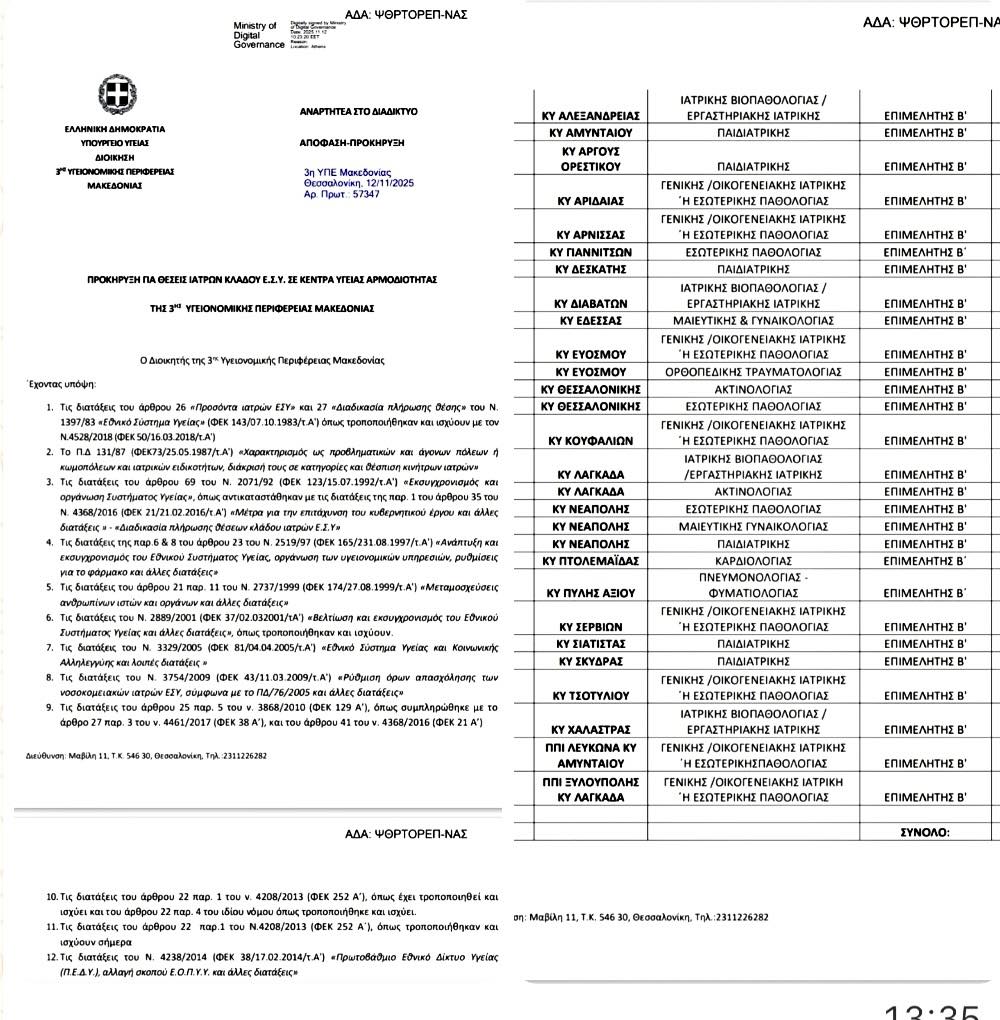 Με την υπ’ αριθ. 57347/12.11.2025 προκήρυξη του Υπουργείου Υγείας, προκηρύσσονται 31 θέσεις ειδικευμένων ιατρών του κλάδου Ε.Σ.Υ. επί θητεία για την κάλυψη αναγκών των Κέντρων Υγείας και Μονάδων Υγείας της 3ης Υγειονομικής Περιφέρειας Μακεδονίας.