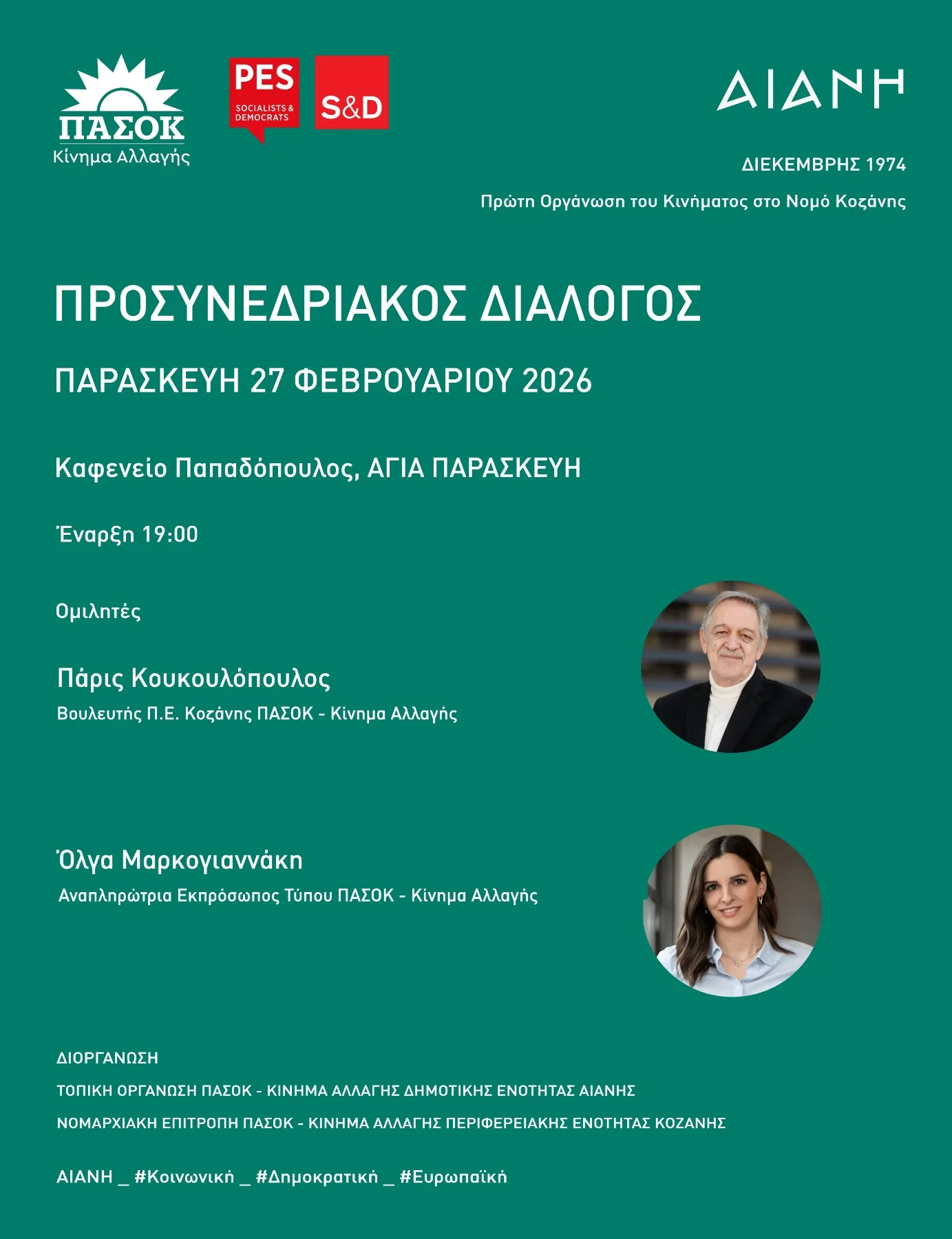 Η Τοπική Οργάνωση ΠΑΣΟΚ – Κινήματος Αλλαγής Δημοτικής Ενότητας Αιανής, σε συνεργασία με τη Νομαρχιακή Επιτροπή Π.Ε. Κοζάνης, προσκαλεί τα μέλη, τους φίλους του κινήματος και τους πολίτες της περιοχής σε ανοιχτή εκδήλωση Προσυνεδριακού Διαλόγου.
