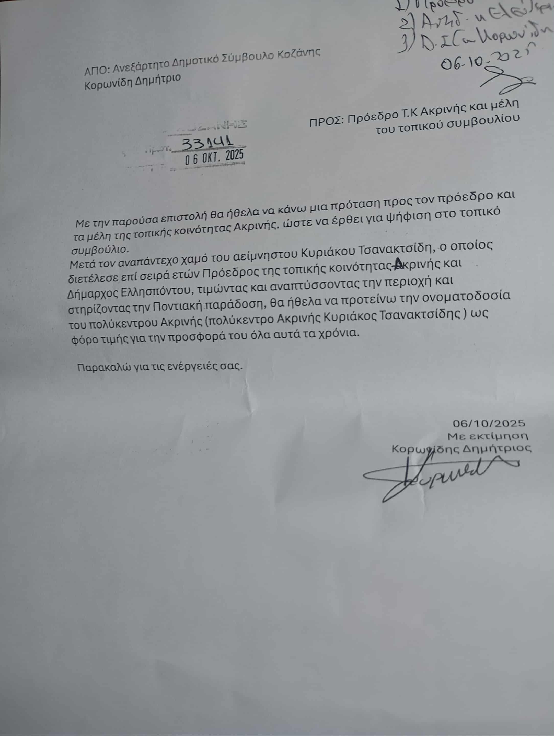 Να δοθεί το όνομα του πρώην Δημάρχου Ελλησπόντου, Κυριάκου Τσανακτίδη, ο οποίος πρόσφατα έφυγε από τη ζωή, στο Πολύκεντρο της Ακρινής προτείνει επίσημα προς το Τοπικό Συμβούλιο Ακρινής, ο ανεξάρτητος δημοτικός σύμβουλος Κοζάνης, Δημήτρης Κορωνίδης.