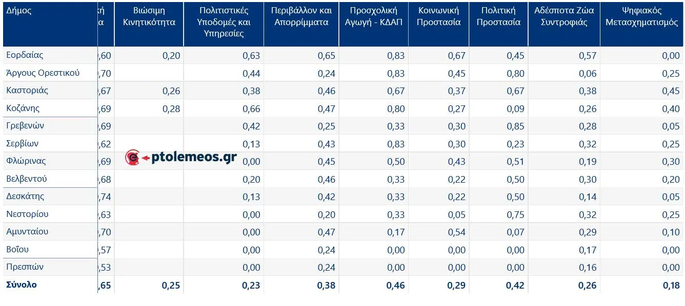 Στην 92η θέση πανελληνίως και 4ος στη Δυτική Μακεδονία καταγράφεται ο Δήμος Κοζάνης με επίδοση 0,45 ενώ ακολουθούν οι Δήμοι Γρεβενών(0,43) Σερβίων και Φλώρινας(0,41) και Βελβεντού(0,39)