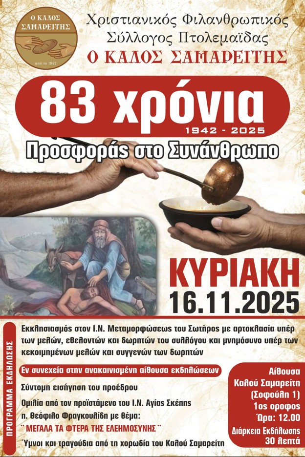 Ο Χριστιανικός Φιλανθρωπικός Σύλλογος Πτολεμαΐδας “Ο Καλός Σαμαρείτης” σας καλεί να τιμήσετε στην ετήσια γιορτή του την Κυριακή 16/11/2025.