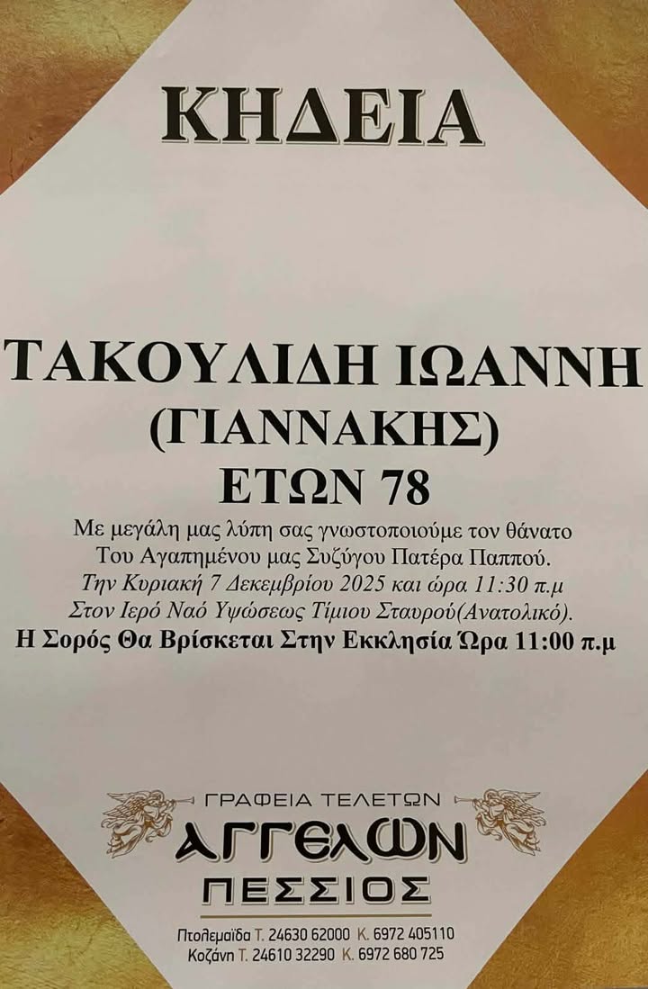 Σε κλίμα οδύνης η οικογένεια και η τοπική κοινωνία της Πτολεμαΐδας αποχαιρετούν τον Ιωάννη Τακουλίδη, γνωστό ως “Γιαννάκη”, που έφυγε από τη ζωή σε ηλικία 78 ετών.