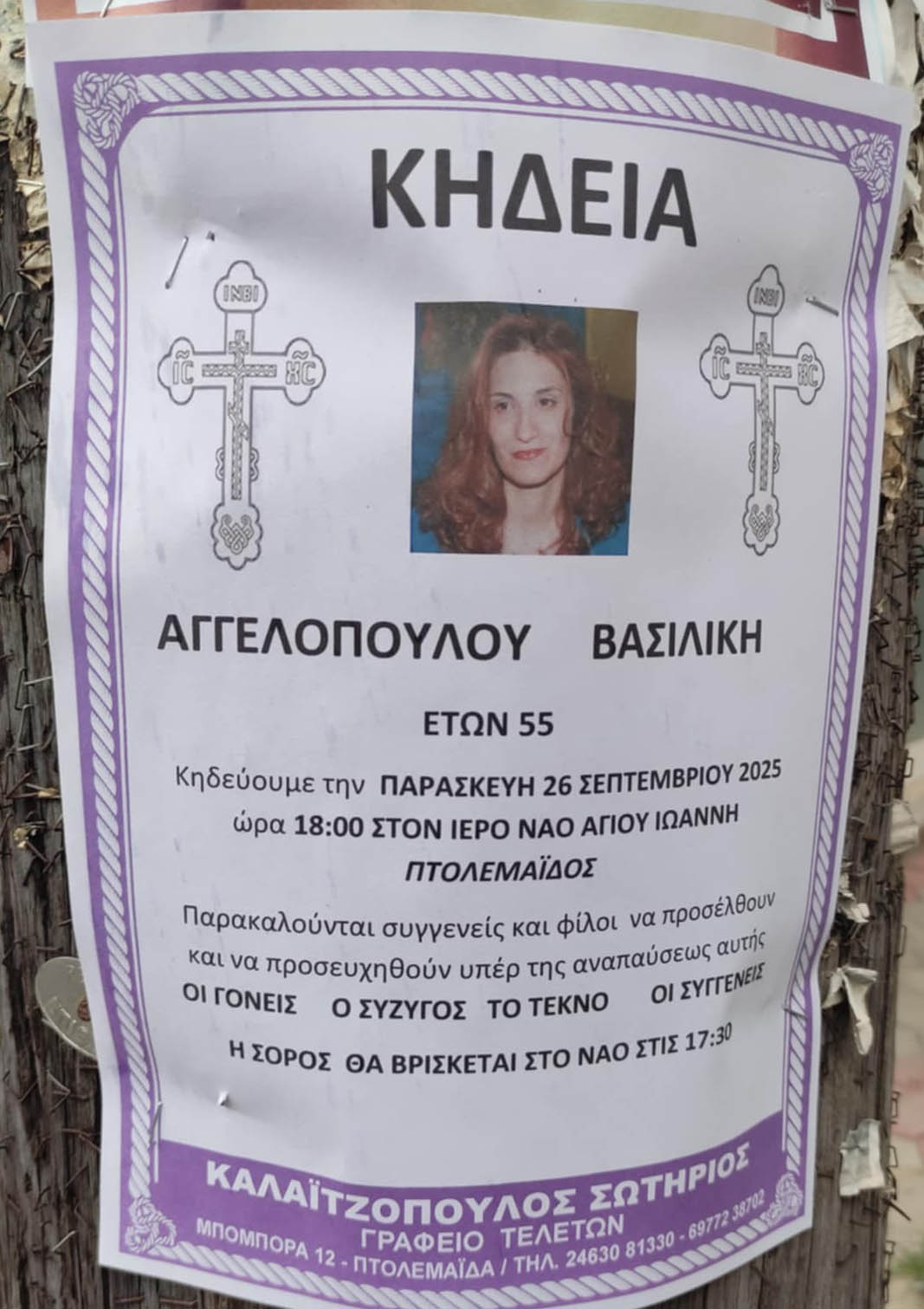 Χθες, Παρασκευή 26 Σεπτεμβρίου 2025, τελέστηκε η εξόδιος ακολουθία της Βασιλικής Αγγελοπούλου, η οποία έφυγε πρόωρα από τη ζωή σε ηλικία 55 ετών. Η κηδεία πραγματοποιήθηκε στον Ιερό Ναό Αγίου Ιωάννη Πτολεμαΐδας.