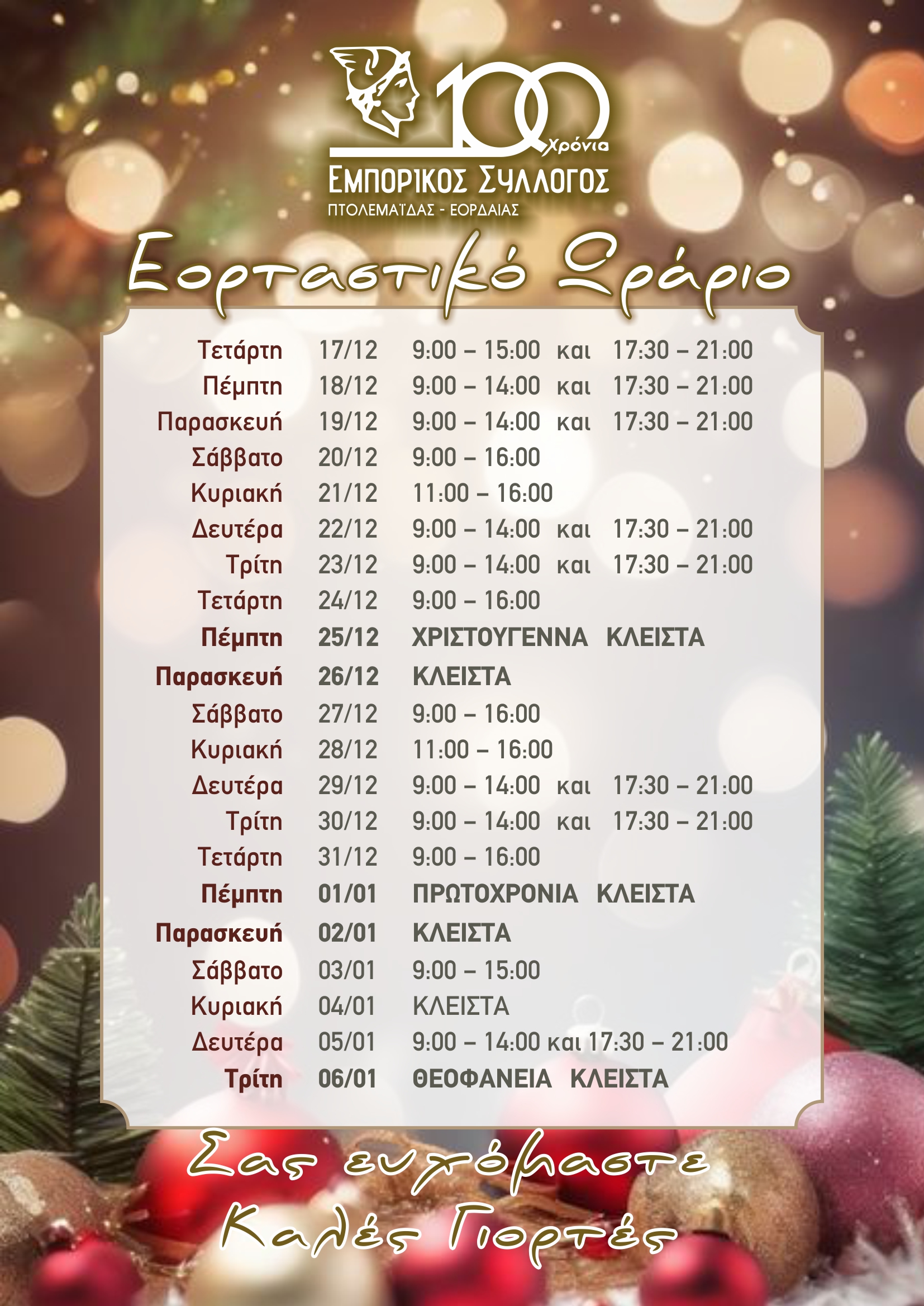 Ο Εμπορικός Σύλλογος Πτολεμαΐδας – Εορδαίας ανακοίνωσε το εορταστικό ωράριο των εμπορικών καταστημάτων, για την περίοδο των Χριστουγέννων και της Πρωτοχρονιάς που διανύουμε.