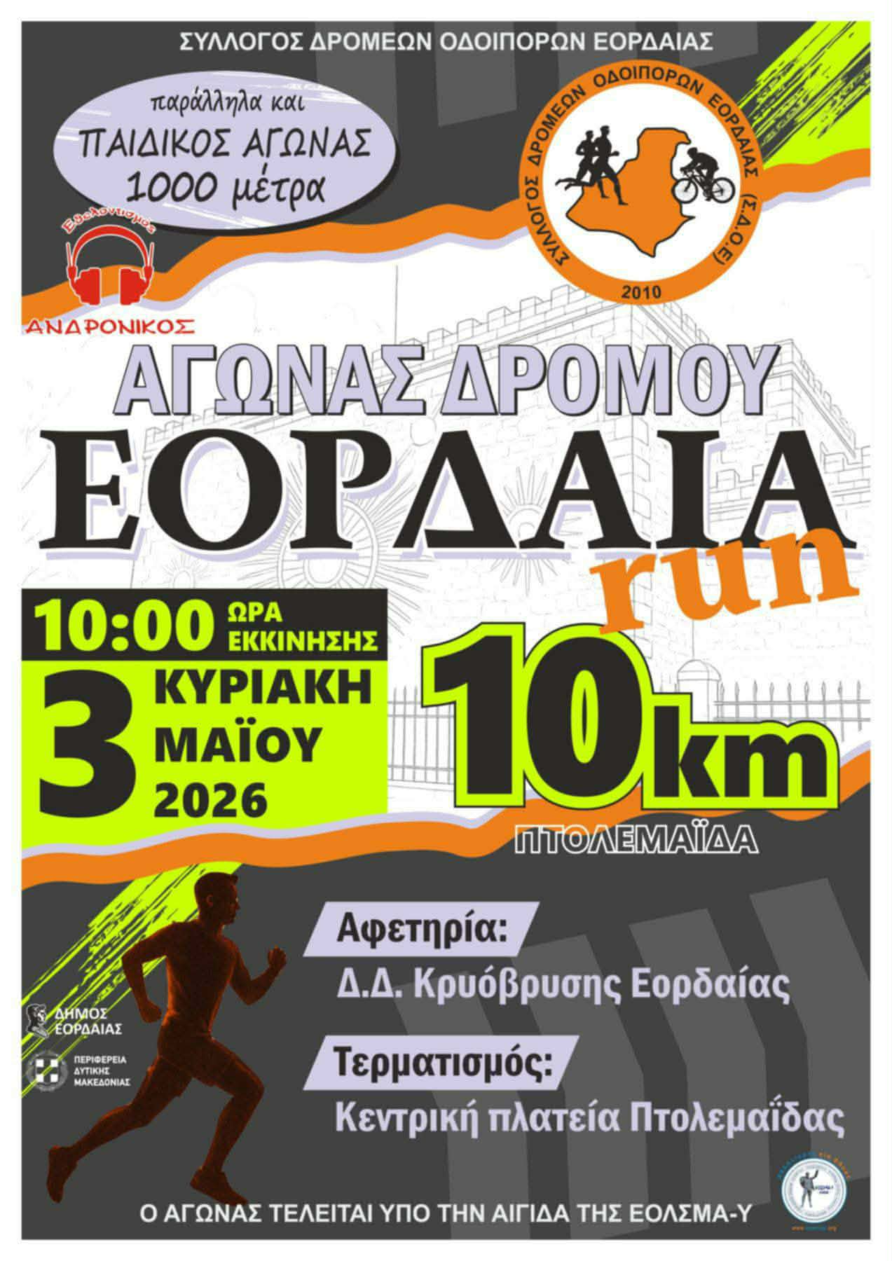 Την Κυριακή 3 Μαΐου 2026 θα διεξαχθεί στην Πτολεμαΐδα το Eordaia Run 2026, μια αθλητική διοργάνωση που φιλοξενείται στον Δήμο Εορδαίας και έχει στόχο την προώθηση των αξιών του αθλητισμού, της ευγενούς άμιλλας και του μαζικού δρομικού κινήματος.