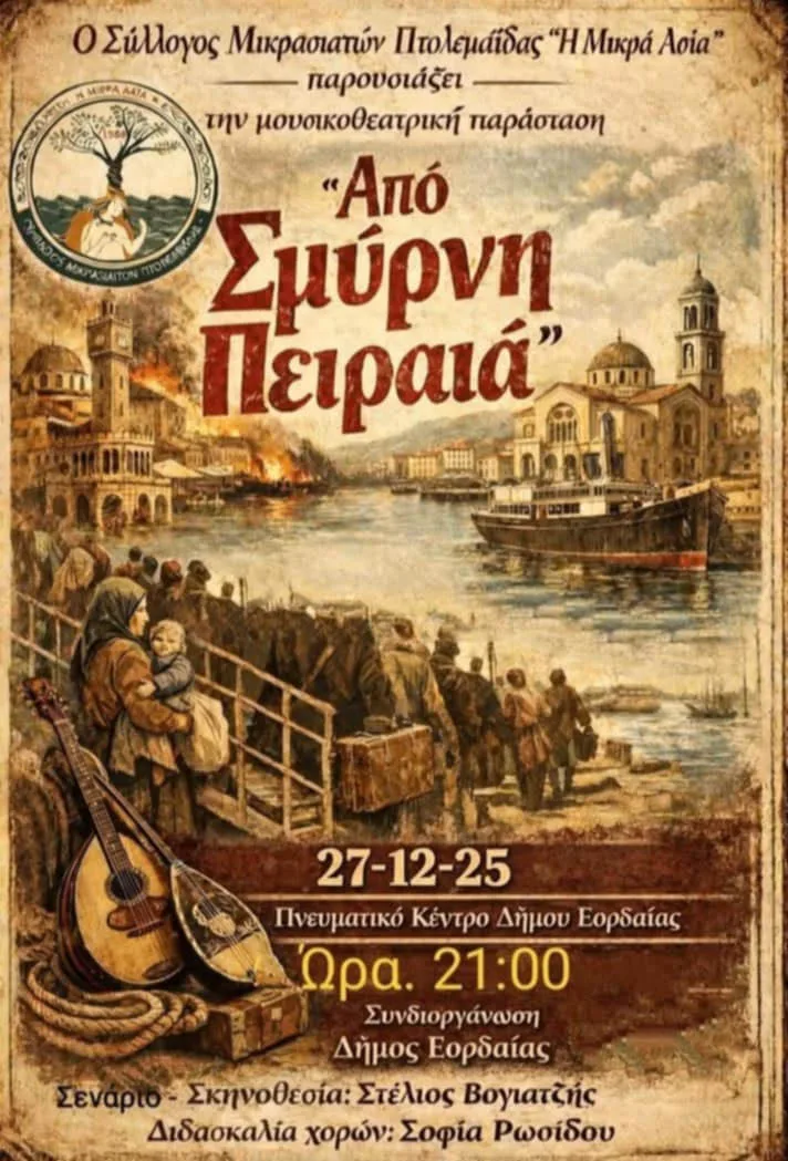 Μια βραδιά μνήμης και συγκίνησης υπόσχεται η σημερινή μουσικοθεατρική παράσταση «Από Σμύρνη… Πειραιά», που παρουσιάζει ο Σύλλογος Μικρασιατών Πτολεμαΐδας «Η Μικρά Ασία» στο Πνευματικό Κέντρο Δήμου Εορδαίας, στις 21:00.