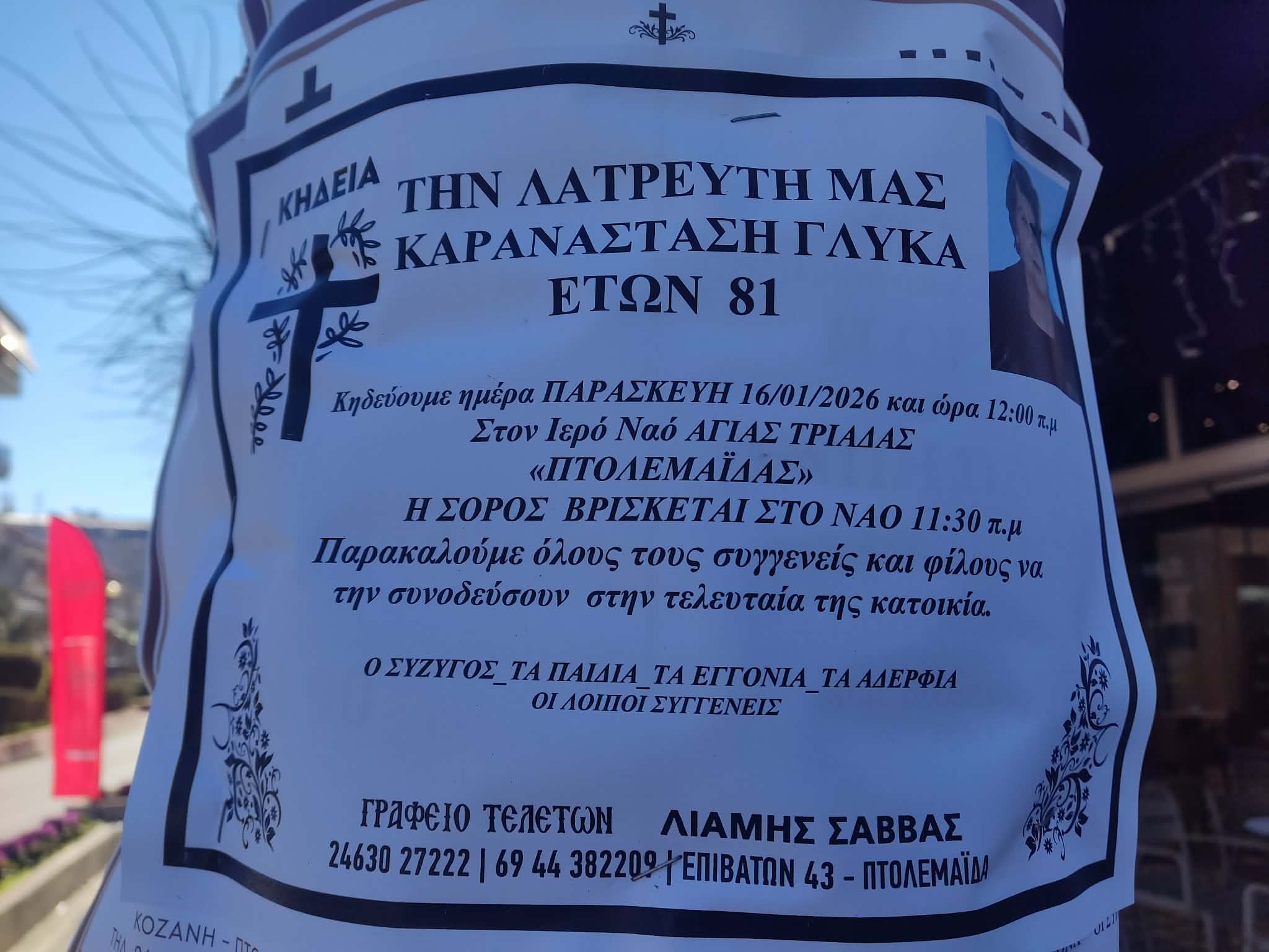Σε ηλικία 81 ετών “έφυγε” από τη ζωή η Γλύκα Καραναστάση στην Πτολεμαΐδα. Η εξόδιος ακολουθία θα πραγματοποιηθεί την Παρασκευή 16/1 και ώρα 12:00 στον Ιερό Ναό Αγίας Τριάδας Πτολεμαΐδας.