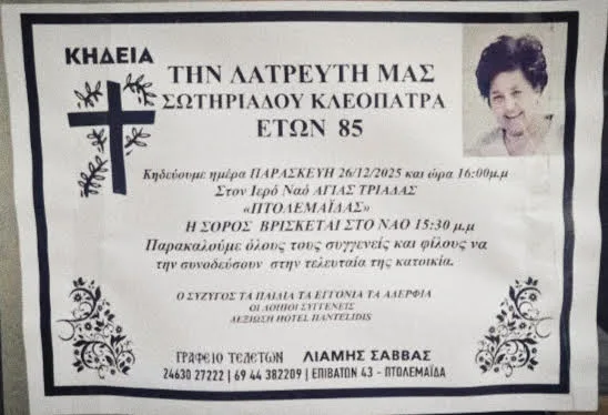 Σε κλίμα συγκίνησης αποχαιρετούν σήμερα συγγενείς και φίλοι την Κλεοπάτρα Σωτηριάδου, η οποία έφυγε από τη ζωή σε ηλικία 85 ετών. Η εξόδιος ακολουθία τελείται την Παρασκευή 26 Δεκεμβρίου 2025, στις 16:00, στον Ιερό Ναό Αγίας Τριάδας Πτολεμαΐδας, ενώ η σορός θα βρίσκεται στο ναό από τις 15:30.