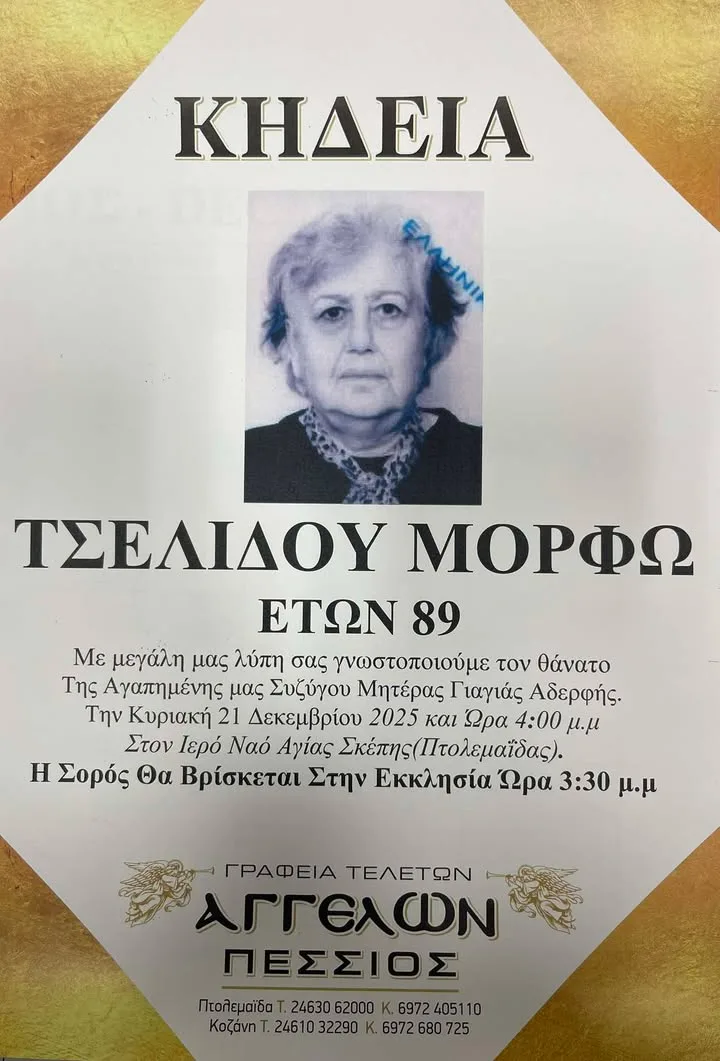 Σήμερα, Κυριακή 21 Δεκεμβρίου 2025, κηδεύεται η Μόρφω Τσελίδου, η οποία έφυγε από τη ζωή σε ηλικία 89 ετών. Η εξόδιος ακολουθία θα τελεστεί στις 4:00 μ.μ. στον Ιερό Ναό Αγίας Σκέπης Πτολεμαΐδας.