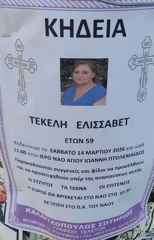 Σε ηλικία 59 ετών έφυγε από τη ζωή η Ελισσάβετ Τεκελή στην Πτολεμαΐδα. Η κηδεία της θα πραγματοποιηθεί το Σάββατο 14/3 και ώρα 11:00 στον Ιερό Ναό Αγίου Ιωάννη Πτολεμαΐδος.