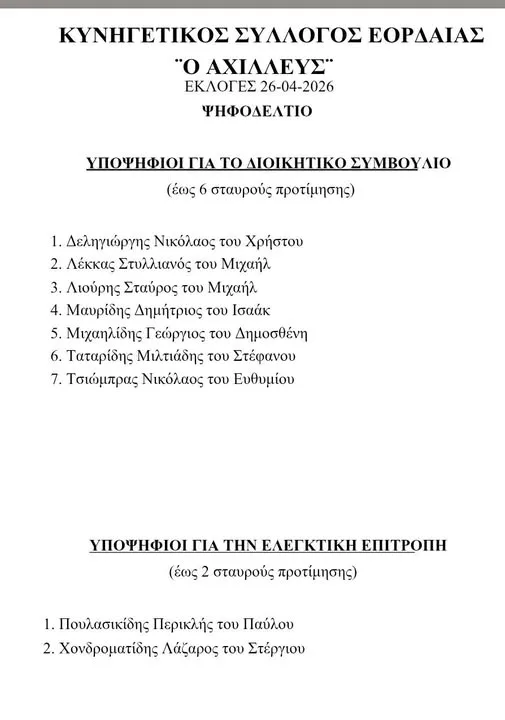 Σε Γενική Συνέλευση και εκλογές προχωρά την Κυριακή 26 Απριλίου 2026 ο Κυνηγετικός Σύλλογος Εορδαίας «Ο Αχιλλεύς», με στόχο την ανάδειξη νέου Διοικητικού Συμβουλίου και Ελεγκτικής Επιτροπής.