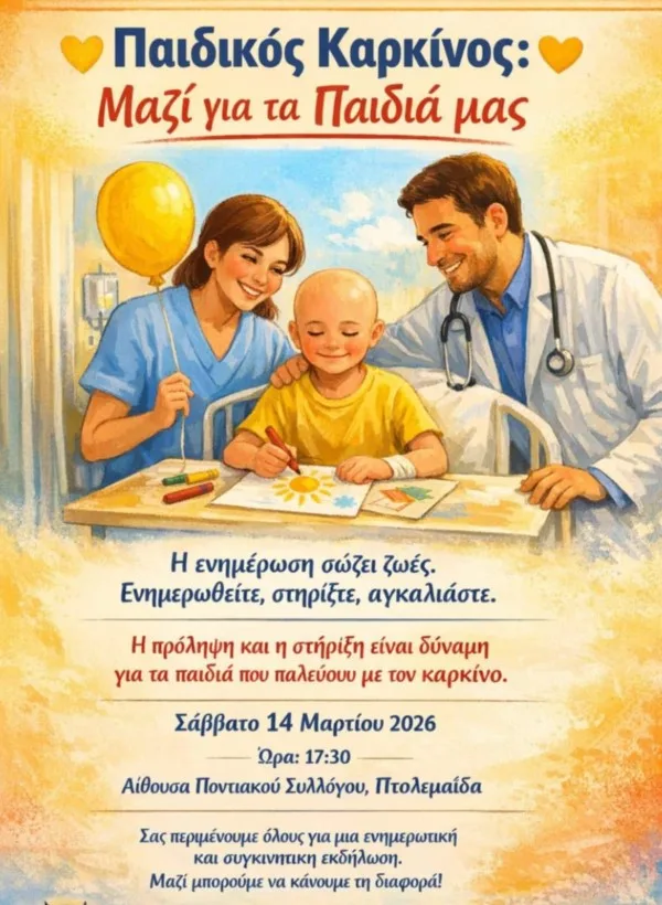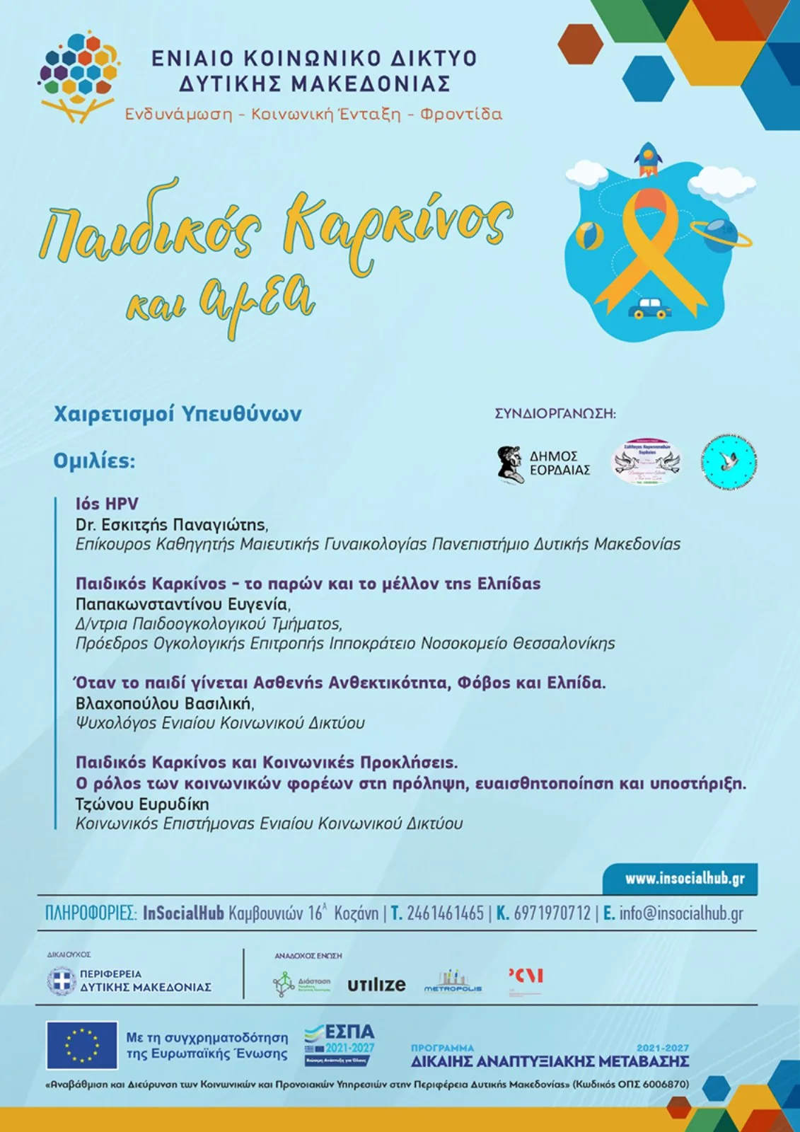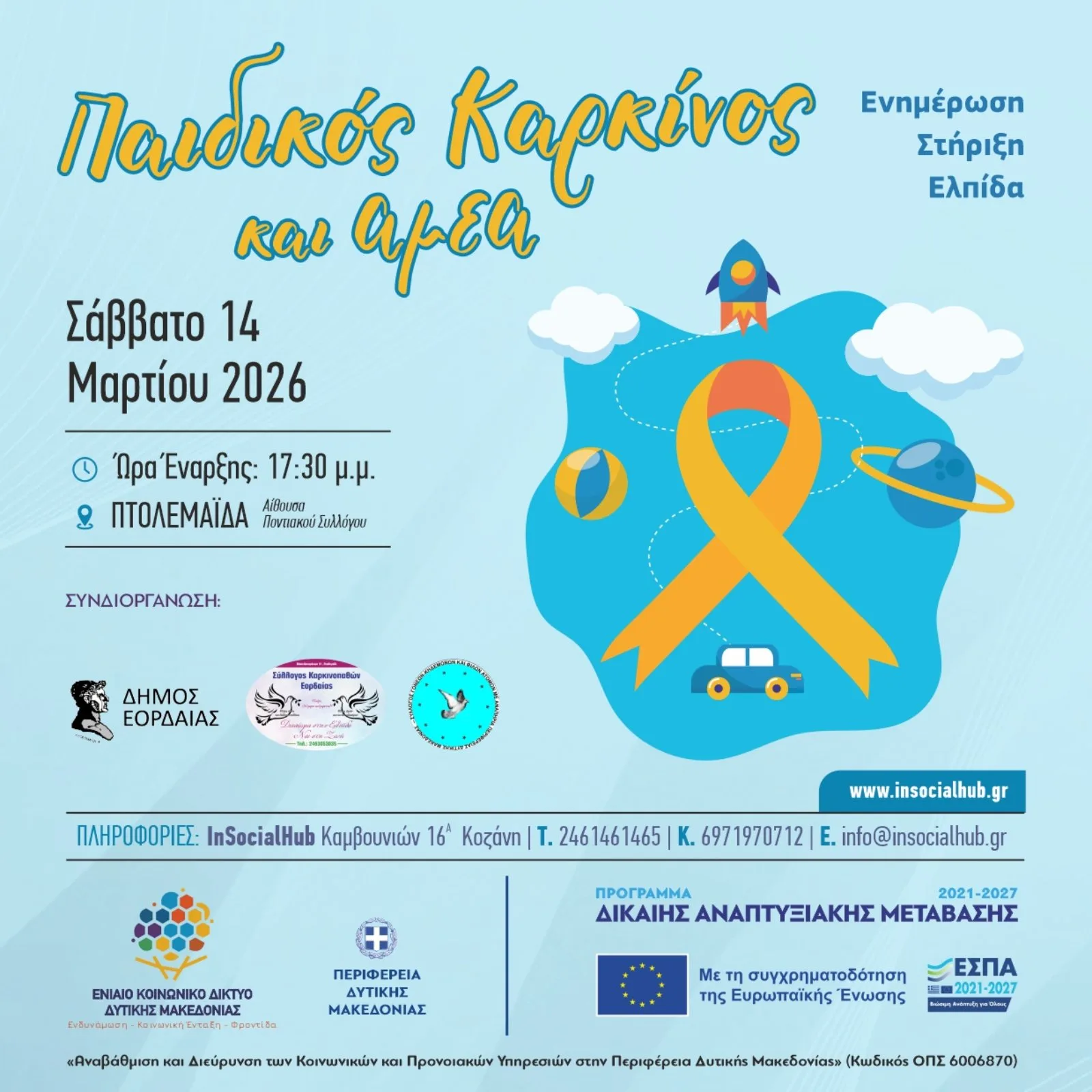 Ο Σύλλογος Καρκινοπαθών Εορδαίας σε συνεργασία με τον Σύλλογο Γονέων- Κηδεμόνων και Φίλων Ατόμων με Αναπηρία Περιφέρειας Δυτικής Μακεδονίας, με τον Δήμο Εορδαίας και το Ενιαίο Κοινωνικό Δίκτυο Δυτικής Μακεδονίας σας προσκαλεί στην ενημερωτική εκδήλωση για τον Παιδικό Καρκίνο .