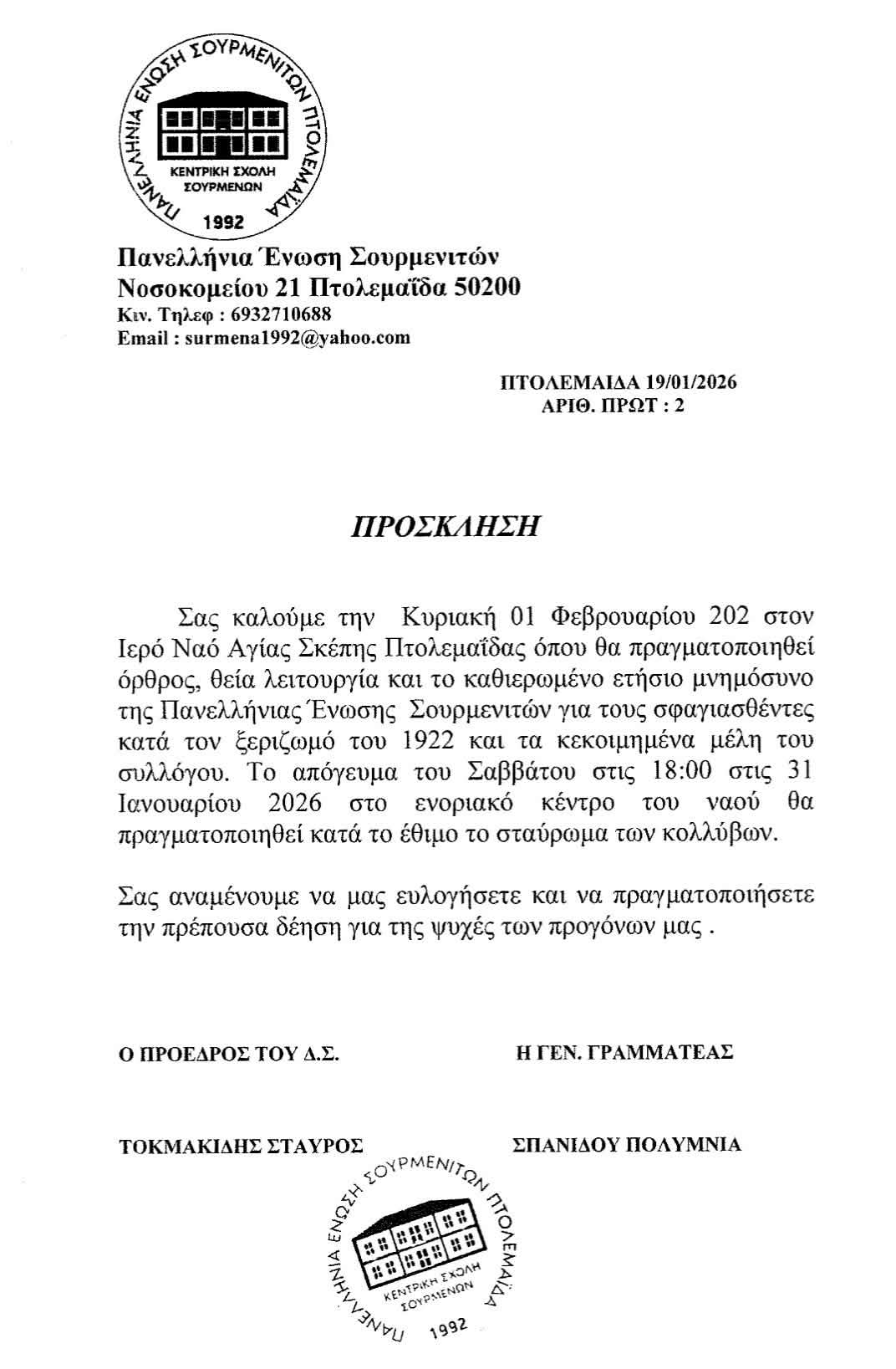 Την Κυριακή 1 Φεβρουαρίου στον Ιερό Ναό Αγίας Σκέπης Πτολεμαΐδας θα πραγματοποιηθεί το ετήσιο μνημόσυνο της Πανελλήνιας Ένωσης Σουρμενιτών. Το απόγευμα του Σαββάτου 31 Ιανουαρίου θα γίνει στον ναό το σταύρωμα των κολλύβων: