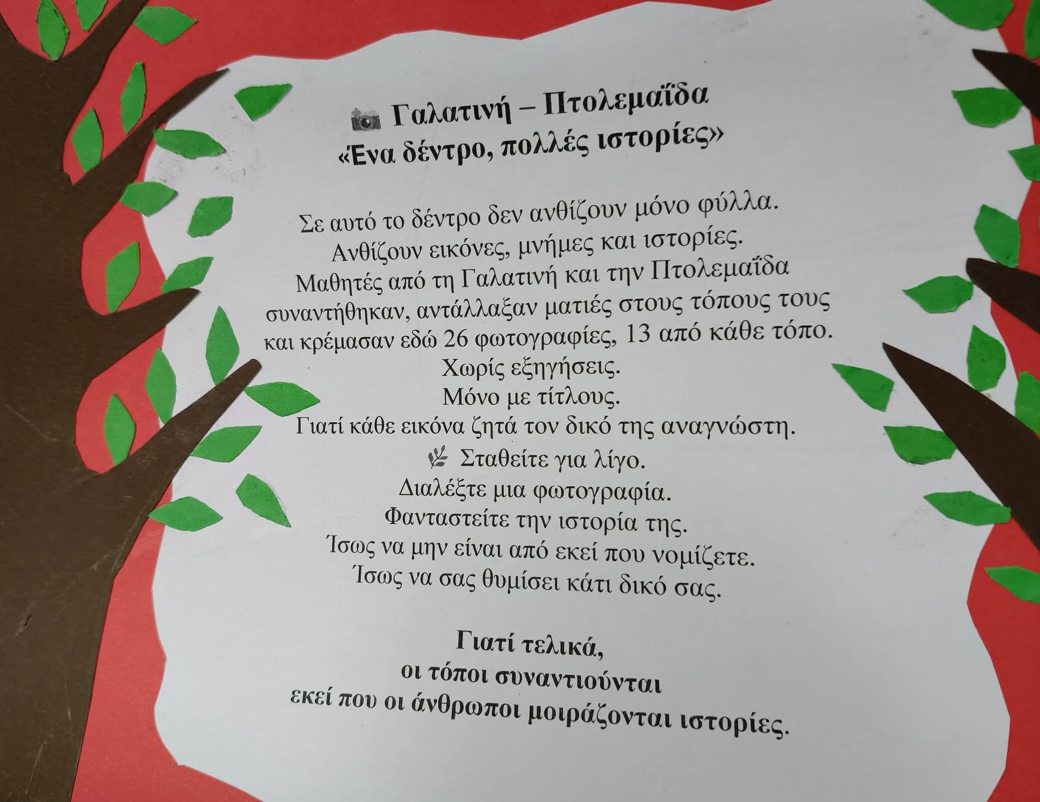 Μέσα από την παρουσίαση σύγχρονων και παλαιότερων φωτογραφιών, οι μαθητές της Γαλατινής και της Πτολεμαΐδας είχαν την ευκαιρία να γνωρίσουν καλύτερα ο ένας τον τόπο του άλλου, ανακαλύπτοντας πτυχές της ιστορίας, της καθημερινότητας και της πολιτιστικής ταυτότητας των δύο περιοχών.