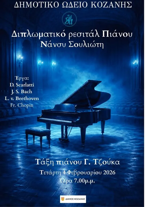 Διπλωματικό ρεσιτάλ πιάνου παρουσιάζει η Νάνσυ Σουλιώτη, μαθήτρια της τάξης πιάνου του Γ. Τζούκα, στο Δημοτικό Ωδείο Κοζάνης, την Τετάρτη 4 Φεβρουαρίου 2026 και ώρα 7.00 μ.μ.