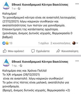 Σε αναστολή λειτουργίας βρίσκεται για 2η συνεχόμενη ημέρα το Χιονοδρομικό Κέντρο Βασιλίτσας, καθώς οι καιρικές συνθήκες δεν επιτρέπουν την ασφαλή δραστηριότητα στις πίστες του.