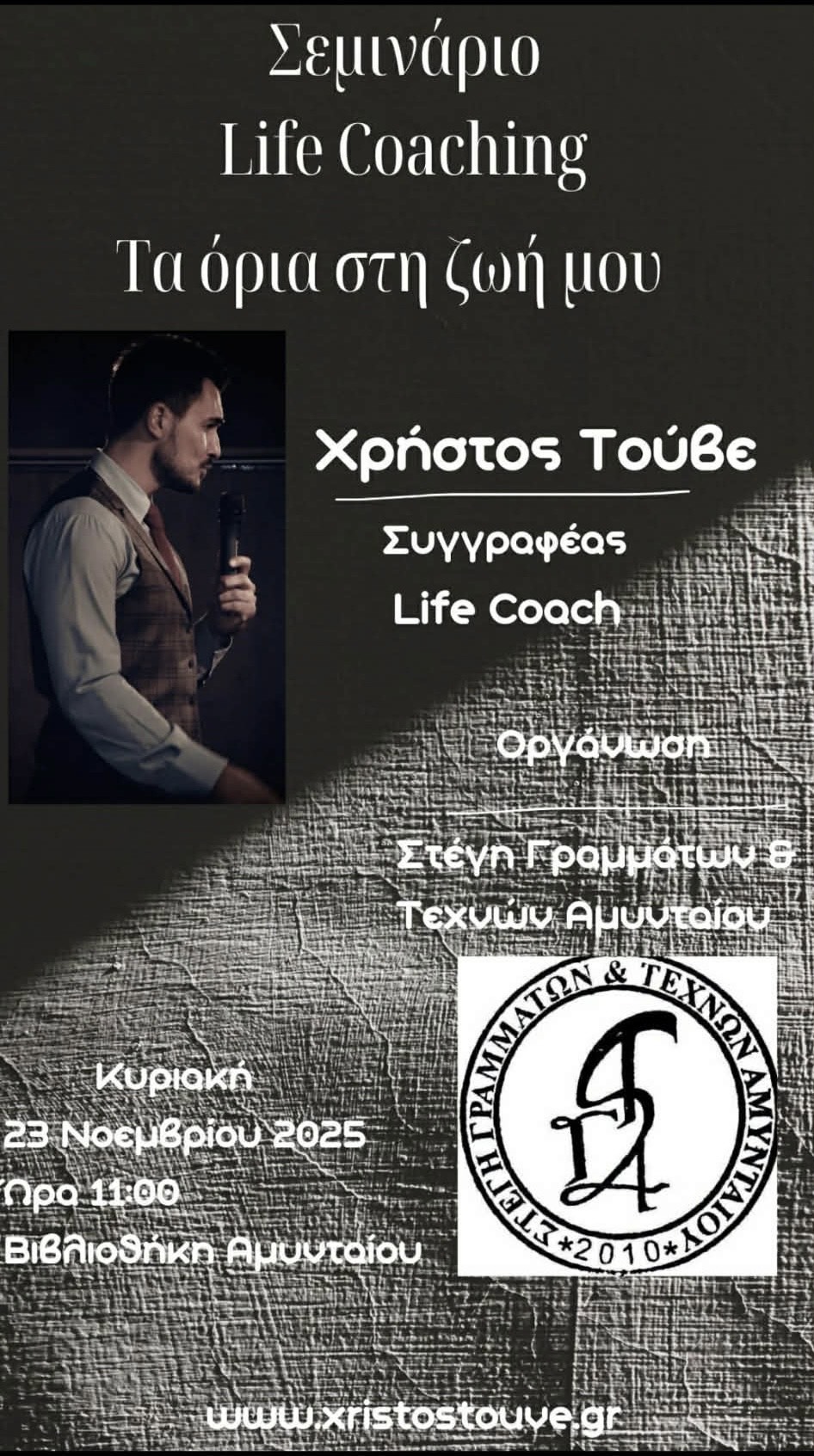 Η Στέγη Γραμμάτων & Τεχνών Αμυνταίου διοργανώνει σεμινάριο Life Coaching την Κυριακή 23 Νοεμβρίου και ώρα 11:00 στη Βιβλιοθήκη Αμυνταίου. Την εισήγηση θα πραγματοποιήσει ο Συγγραφέας/Life Coach Χρήστος Τούβε.