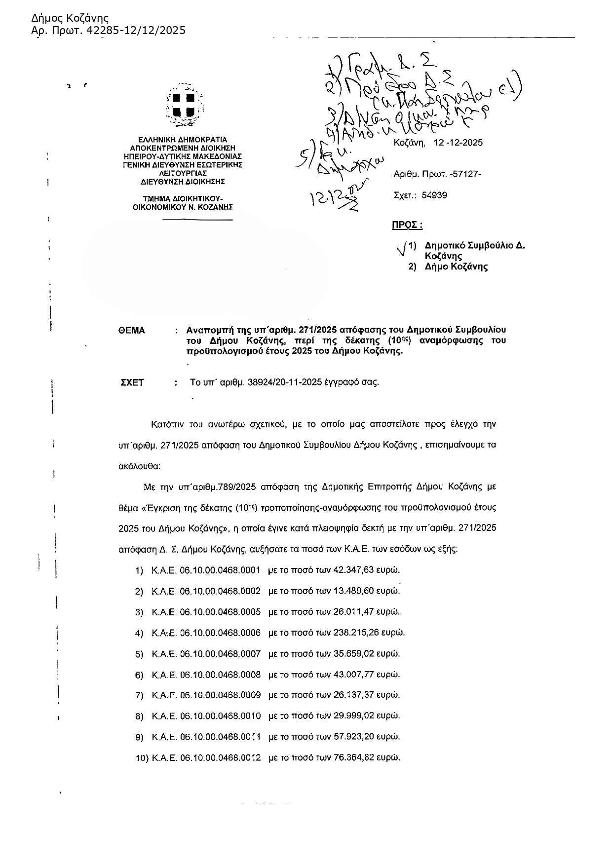 Με μεγάλη ικανοποίηση πληροφορηθήκαμε ότι η Αποκεντρωμένη Διοίκηση Ηπείρου – Δυτ. Μακεδονίας με το έγγραφό της με αρ. πρωτ. 54939/12-12-2025 αναπέμπει προς επαναδιατύπωση την απόφαση 271/2025 του Δημοτικού Συμβουλίου σύμφωνα με την οποία ποσά συνολικού ύψους 632.674,76 ευρώ που προέρχονται από το ειδικό τέλος ΑΠΕ για 13 τοπικές κοινότητες του Δήμου χρησιμοποιήθηκαν για την αποπληρωμή χρέους του Δήμου Κοζάνης προς την ΔΕΥΑΚ για κόστος τηλεθέρμανσης.