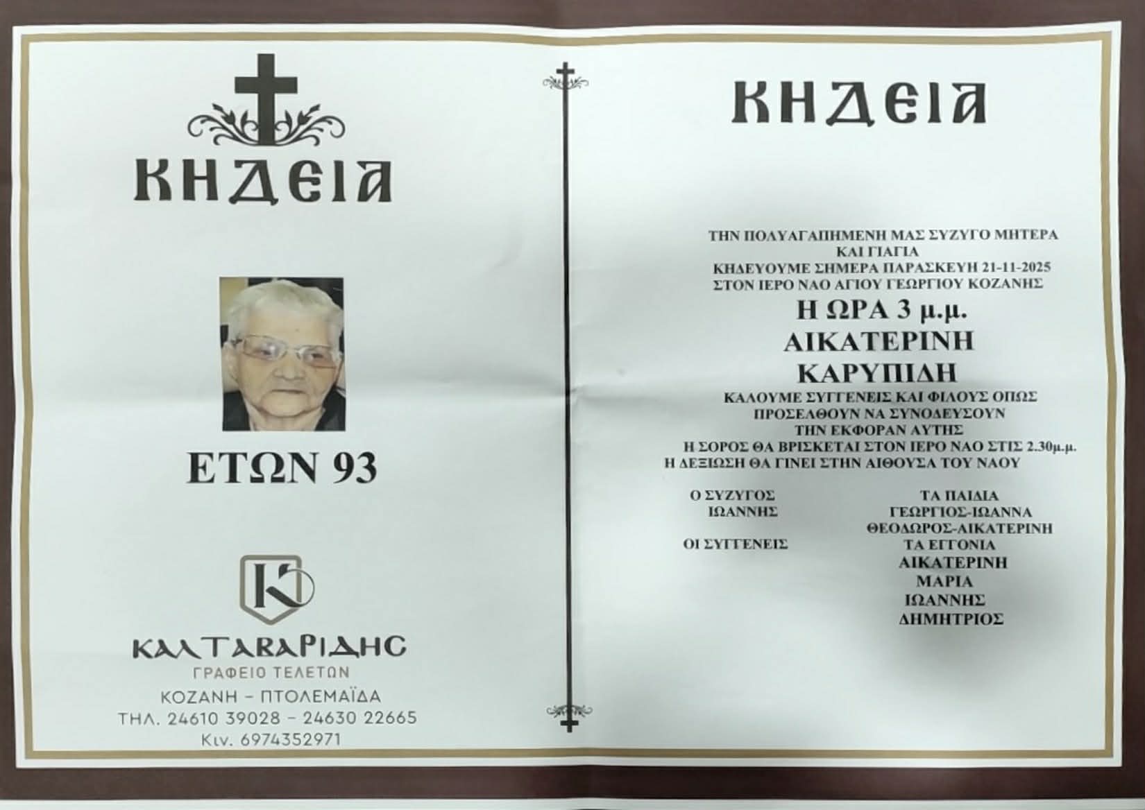 “Έφυγε” από τη ζωή πλήρης ημερών, σε ηλικία 93 ετών η Αικατερίνη Καρυπίδη, μητέρα του πρώην Περιφερειάρχη Δυτικής Μακεδονίας Θεόδωρου Καρυπίδη. Η εξόδιος ακολουθία θα τελεστεί σήμερα Παρασκευή 21/11 και ώρα 15:00 στον Ι.Ν. Αγίου Γεωργίου Κοζάνης.