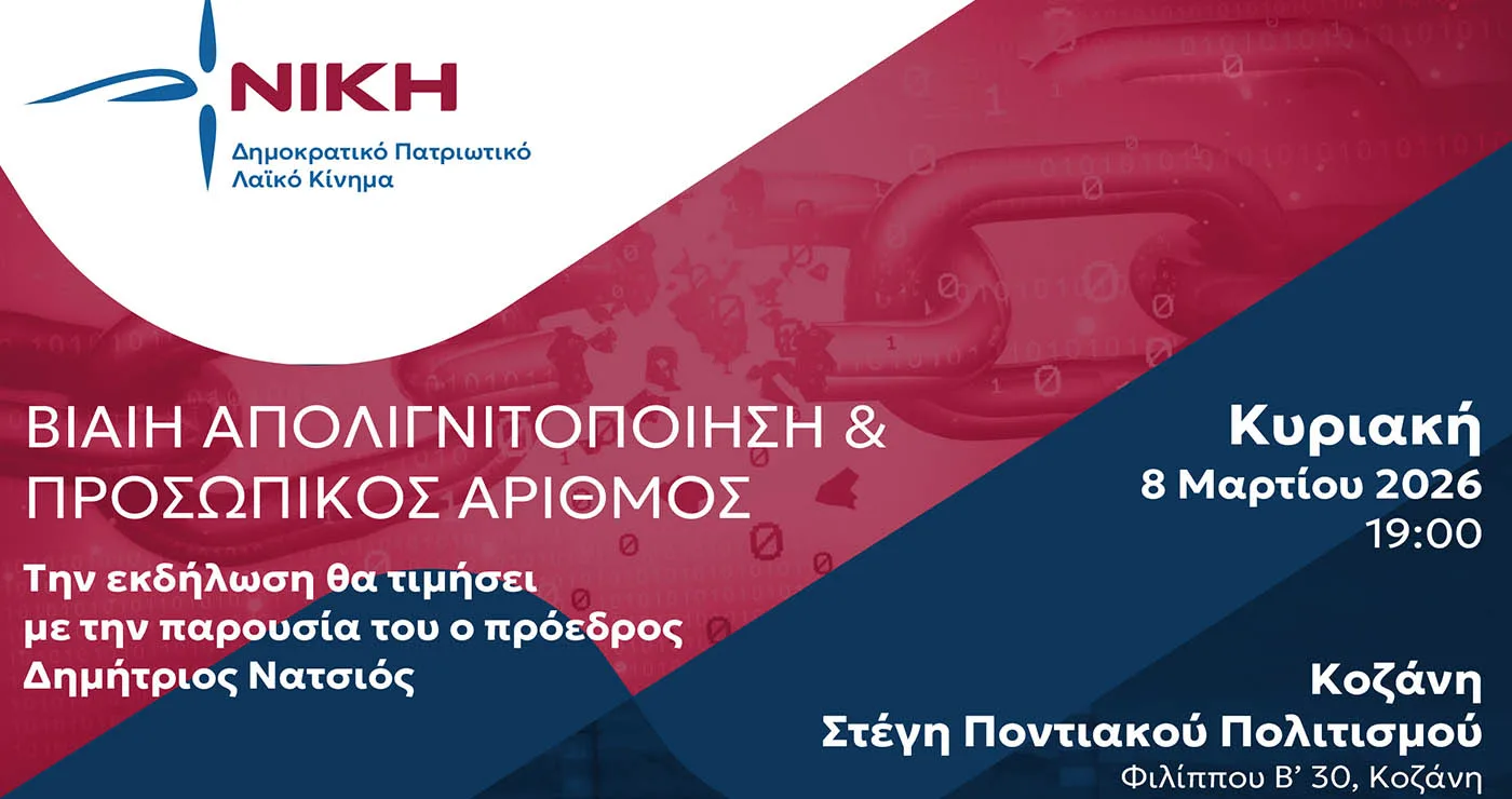 Εκδήλωση στην Κοζάνη διοργανώνει την Κυριακή 8 Μαρτίου 2026 το πολιτικό κόμμα ΝΙΚΗ, θέτοντας στο επίκεντρο τη βίαιη απολιγνιτοποίηση και την καθιέρωση του Προσωπικού Αριθμού. Η συζήτηση πραγματοποιείται σε μια περίοδο που η Δυτική Μακεδονία συνεχίζει να αντιμετωπίζει τις επιπτώσεις της ενεργειακής μετάβασης, ενώ παράλληλα εξελίσσεται δημόσιος διάλογος για ζητήματα ψηφιακής διακυβέρνησης.