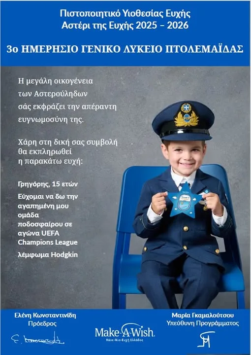 Σε μια ιδιαίτερα συγκινητική πρωτοβουλία προχώρησε το 3ο Γενικό Λύκειο Πτολεμαΐδας «Αντώνιος Κεραμόπουλλος», συμμετέχοντας στη δράση του Make-A-Wish Ελλάδος και υιοθετώντας την ευχή του 15χρονου Γρηγόρη.