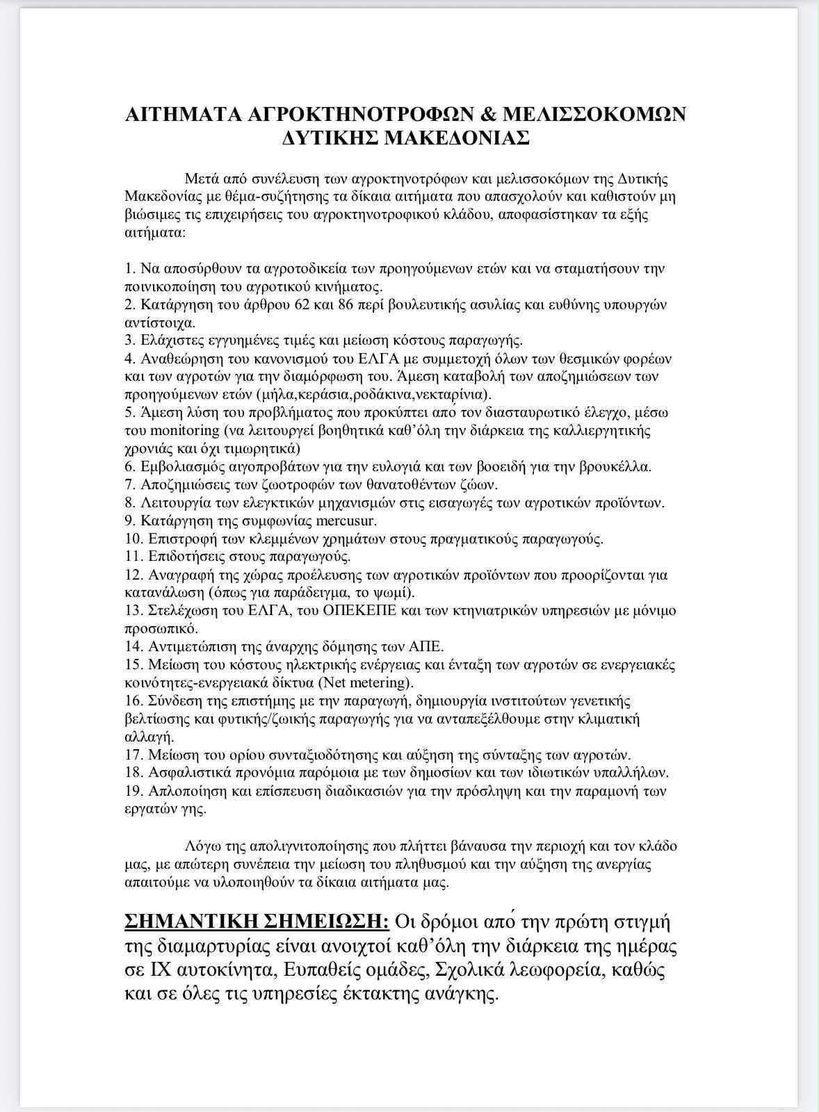 Η γενική συνέλευση κατέληξε σε μια σειρά αιτημάτων, του αγροτοκτηνοτροφικού και μελισσοκομικού κλάδου, που έχουν να κάνουν τόσο με πανελλαδικά, όσο και τοπικά αιτήματα: