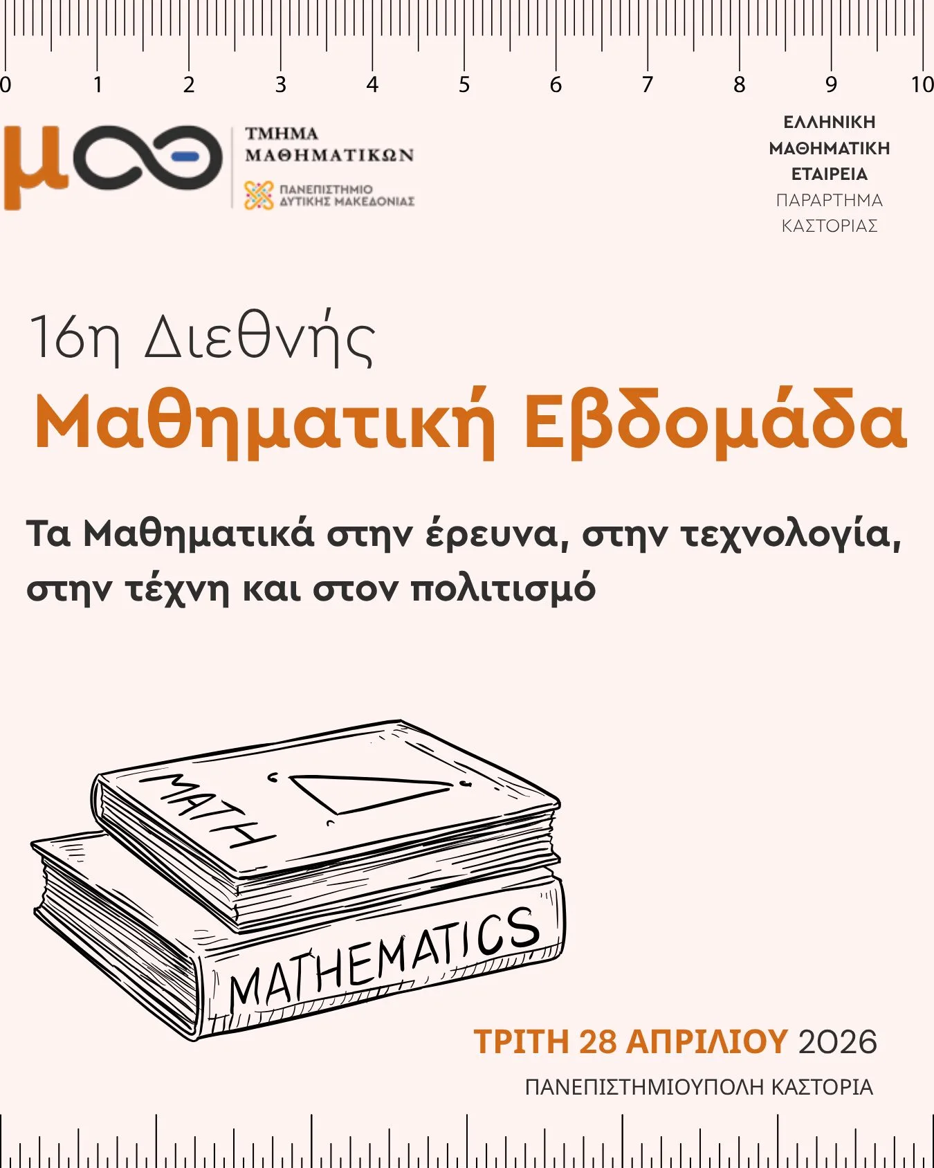 Η διοργάνωση πραγματοποιείται από τις 22 έως τις 28 Απριλίου 2026 από την Ελληνική Μαθηματική Εταιρεία και τα παραρτήματά της. Οι εκδηλώσεις στην Καστοριά, που συνδιοργανώνονται από το Παράρτημα Καστοριάς της Ελληνικής Μαθηματικής Εταιρείας και το Τμήμα Μαθηματικών του Πανεπιστημίου Δυτικής Μακεδονίας, θα πραγματοποιηθούν την Τρίτη 28 Απριλίου 2026, στην Πανεπιστημιούπολη Καστοριάς, από τις 14:00 έως τις 18:30, με τη συμμετοχή μελών ΔΕΠ και φοιτητών/τριών, σε ένα πρόγραμμα που συνδέει τη θεωρία με σύγχρονες εφαρμογές.