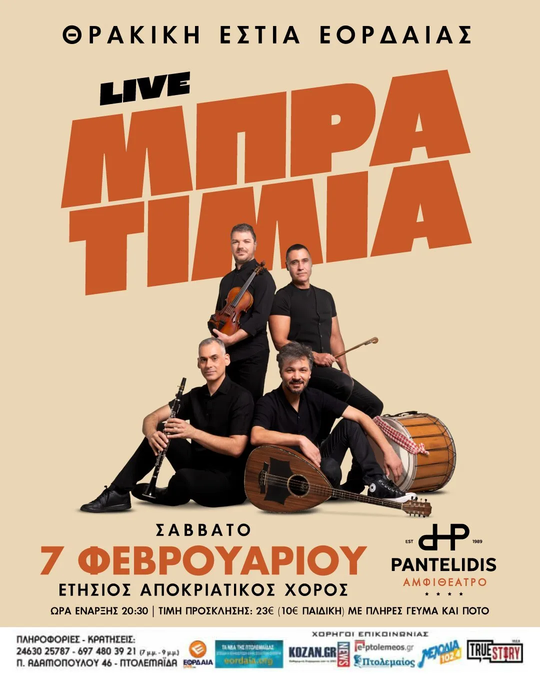 Η Θρακική Εστία Εορδαίας σας προσκαλεί στον Ετήσιο Αποκριάτικο χορό της που θα πραγματοποιηθεί το Σάββατο 7 Φεβρουαρίου στην αίθουσα «Αμφιθέατρο» στο Ξενοδοχείο Pantelidis με ώρα έναρξης 20:30. Μια βραδιά, γεμάτη τραγούδι, κέφι και χορό με τη μπάντα που γλεντά, τα «ΜΠΡΑΤΙΜΙΑ»!