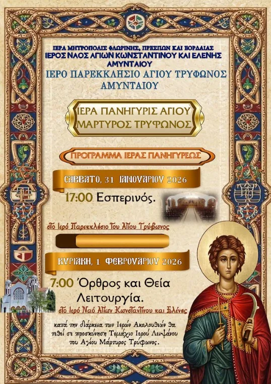Εορτάζει το παρεκκλήσιο του Αγίου Τρύφωνος του Ι.Ν. Αγίων Κωνσταντίνου και Ελένης στο Αμύνταιο την Κυριακή 1 Φεβρουαρίου. Το πρόγραμμα των Ιερών ακολουθιών της Ιεράς Πανήγυρις Αγίου Μάρτυρος Τρύφωνος έχει ως εξής: