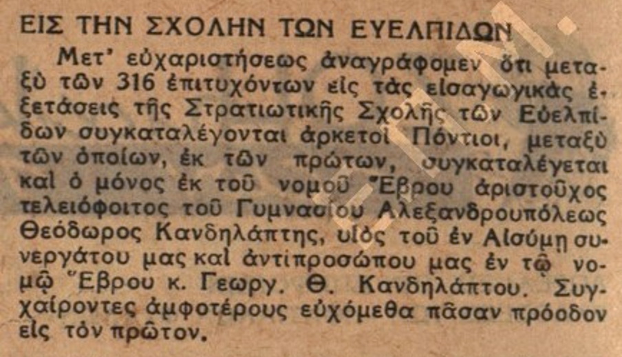 Από το Γυμνάσιο Αλεξανδρουπόλεως στη Σχολή Ευελπίδων
