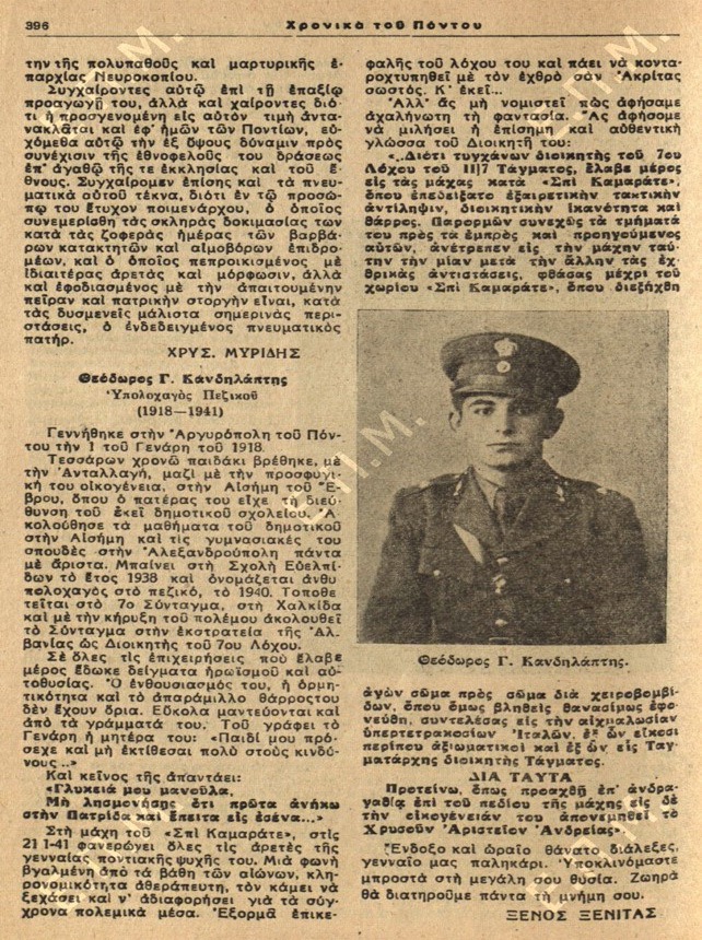 2ον. Στο περιοδικό “ΧΡΟΝΙΚΑ ΤΟΥ ΠΟΝΤΟΥ” έτους 1945, το οποίο αναγράφει ως ημερομηνία θανάτου του την 21/1/1941 στη θέση ΣΠΙ ΚΑΜΑΡΑΤΕ. (το παρόν αφιέρωμα κατατέθηκε από εμένα στην αρμόδια Διεύθυνση του Στρατού, η οποία και μου απέστειλε τα παρακάτω έγγραφα που αφορούν το θάνατό του).