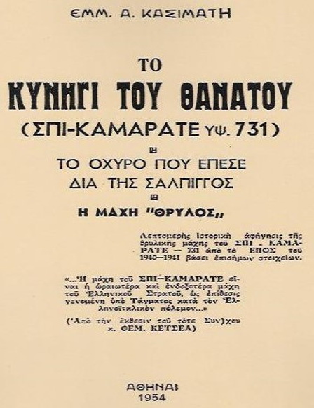 – Το βιβλίο του Εμμ. Κασιμάτη «ΤΟ ΚΥΝΗΓΙ ΤΟΥ ΘΑΝΑΤΟΥ (ΣΠΙ ΚΑΜΑΡΑΤΕ ΥΨ. 731)” – ΤΟ ΟΧΥΡΟ ΠΟΥ ΕΠΕΣΕ ΔΙΑ ΤΗΣ ΣΑΛΠΙΓΓΟΣ – Η ΜΑΧΗ “ΘΡΥΛΟΣ”».