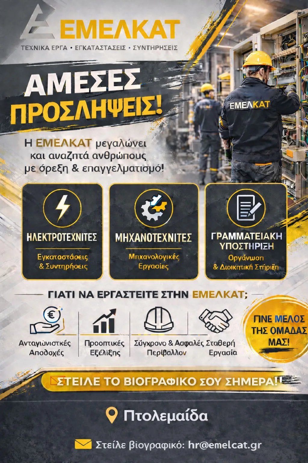 Η εταιρεία ΕΜΕΛΚΑΤ (τεχνικά έργα – εγκαταστάσεις – συντηρήσεις) προχωρά σε άμεσες προσλήψεις στην Πτολεμαΐδα, αναζητώντας ανθρώπους με όρεξη και επαγγελματισμό.