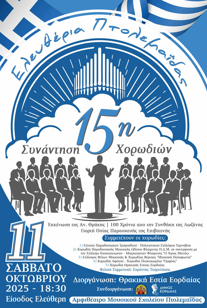 Η 15η Συνάντηση Χορωδιών θα πραγματοποιηθεί το Σάββατο 11 Οκτωβρίου και ώρα 18.30 στο Αμφιθέατρο του Μουσικού Σχολείου Πτολεμαΐδας.