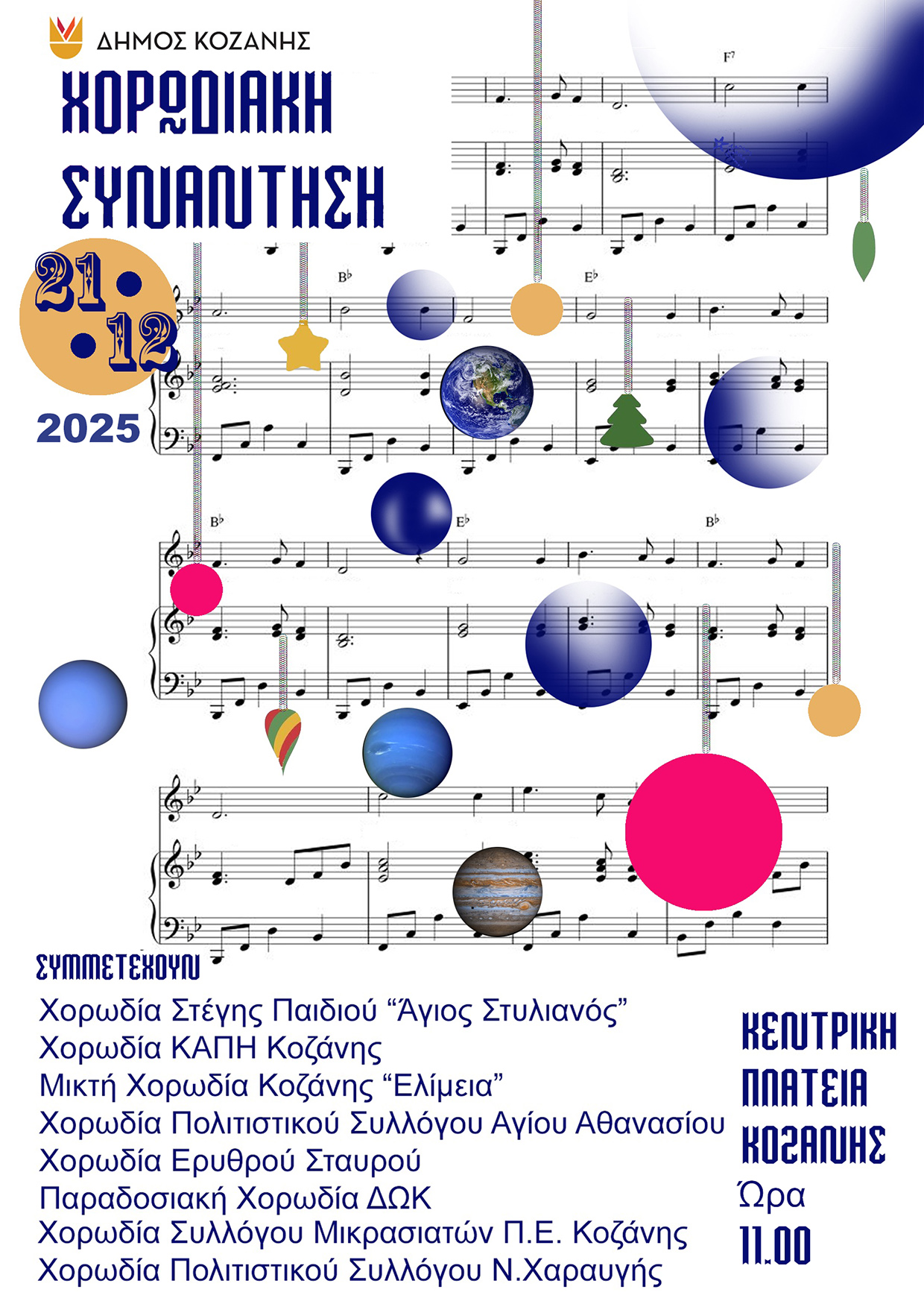 Την Κυριακή 21 Δεκεμβρίου 2025, ο Δήμος Κοζάνης σας προσκαλεί στην όμορφη «Χορωδιακή Συνάντηση» που θα πραγματοποιηθεί στις 11:00 το πρωί στην κεντρική πλατεία Νίκης, στο πλαίσιο του Χριστουγεννιάτικου Προγράμματος του Δήμου Κοζάνης.