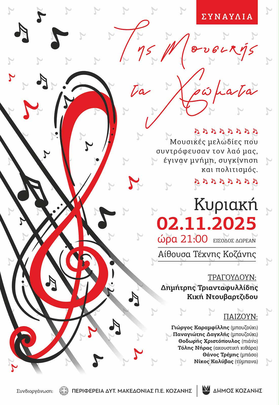 Συναυλία με τίτλο «Της μουσικής τα χρώματα» θα παρουσιαστεί την Κυριακή 2/11 και ώρα 21:00 στην Αίθουσα Τέχνης Κοζάνης. Μουσικές μελωδίες που συντρόφευσαν το λαό μας, έγιναν μνήμη, συγκίνηση και πολιτισμός θα τραγουδήσουν οι Δημήτρης Τριανταφυλλίδης και Κική Ντουβαρτζίδου.